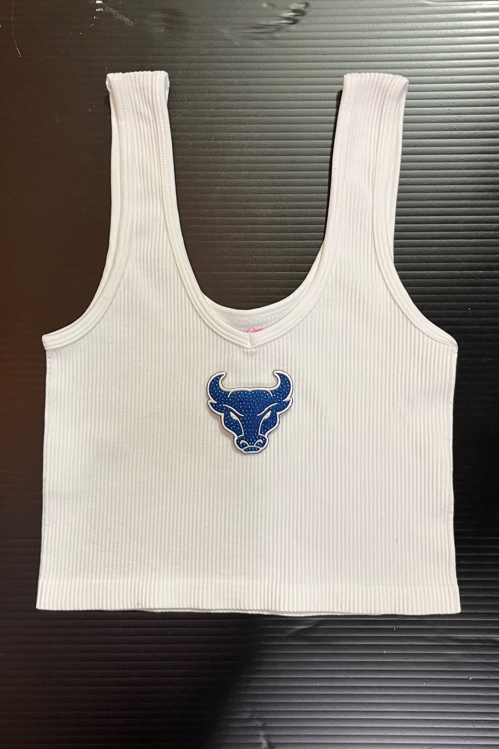 15 inch cropped 1X1 ribbed brami top with SUNY University at Buffalo logo. 92% Nylon 8% Spandex