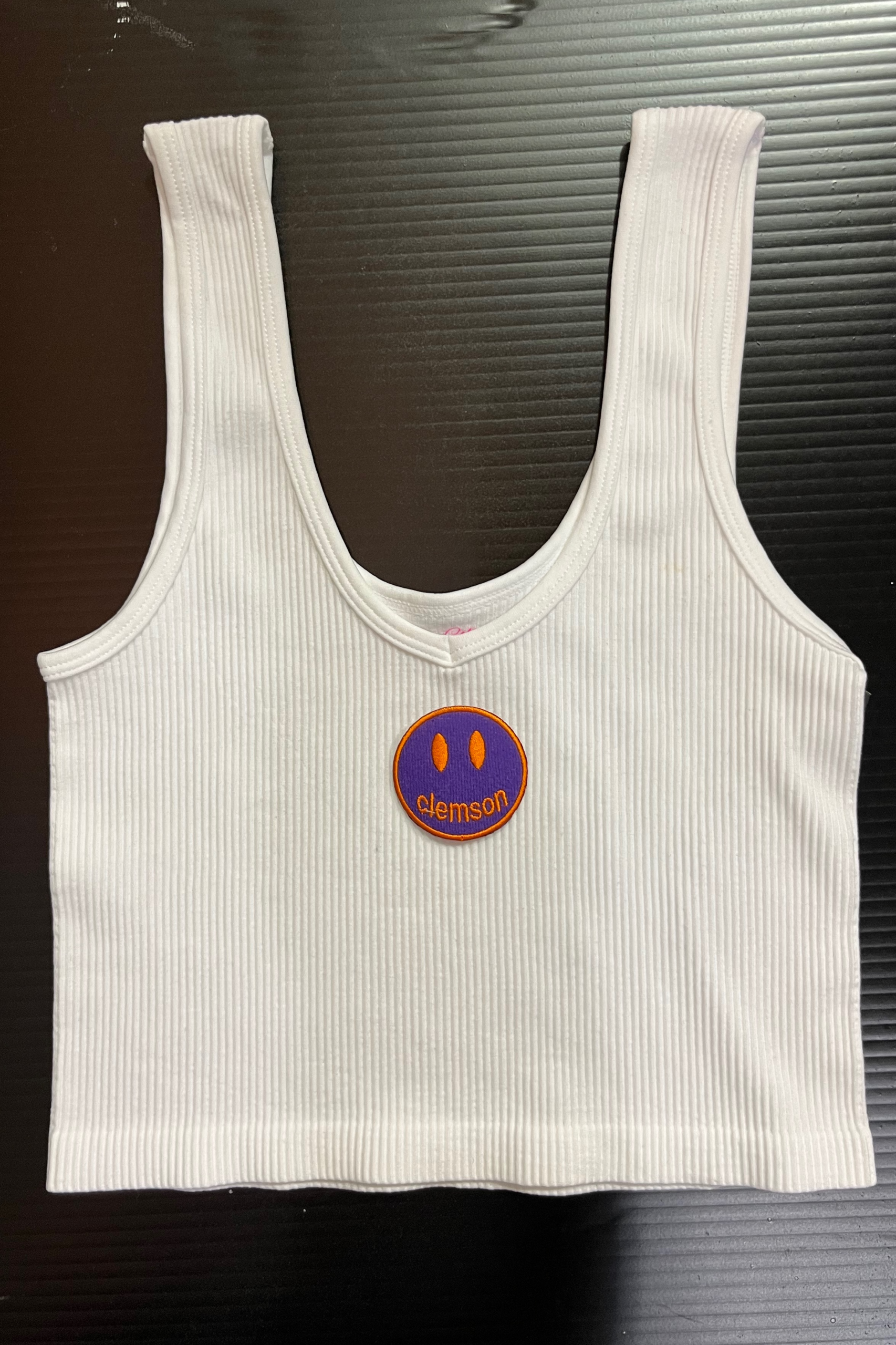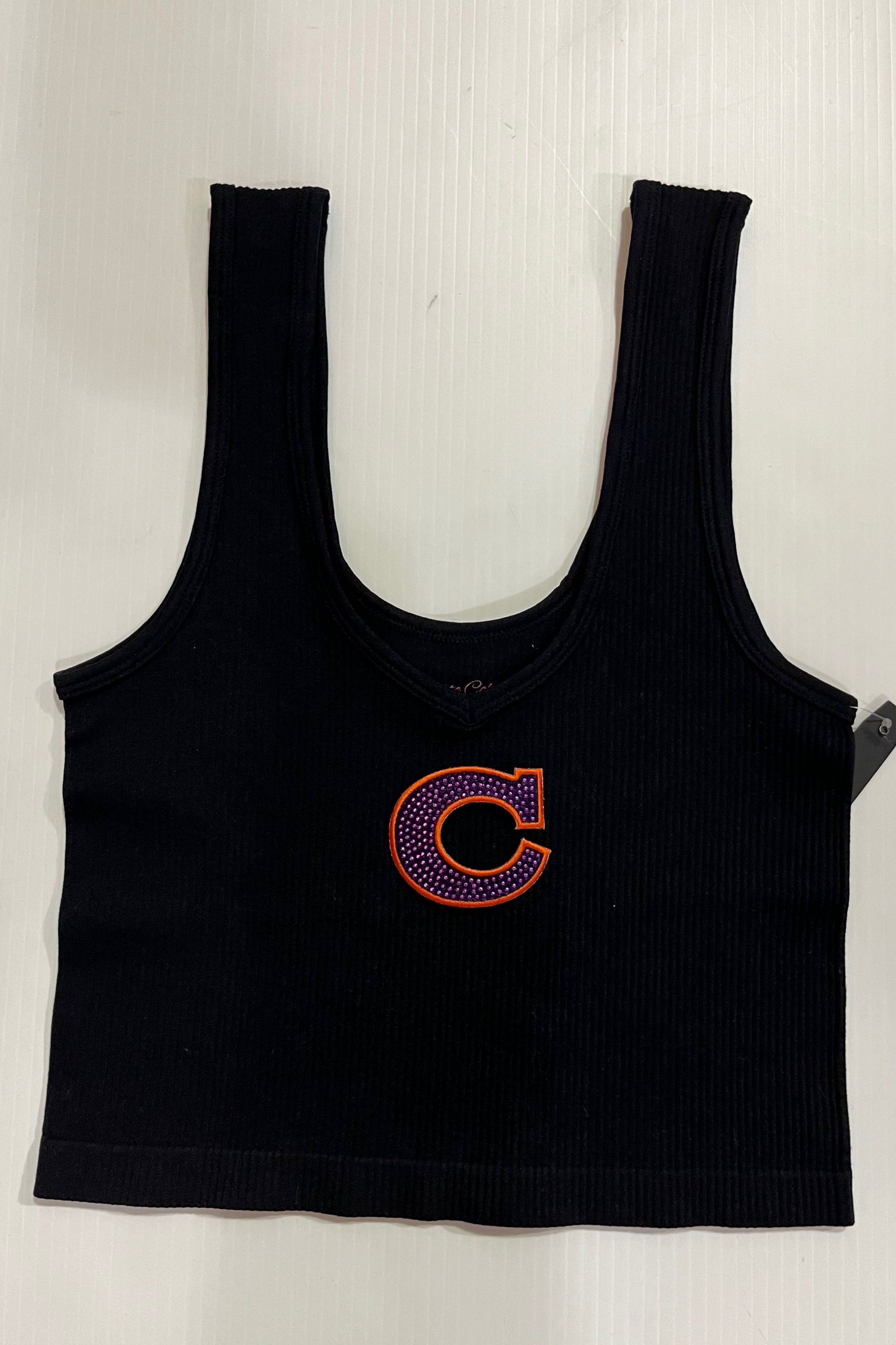 15 inch cropped 1X1 ribbed brami top with the Clemson logo. 92% Nylon 8% Spandex
