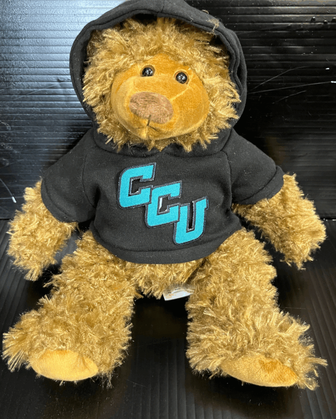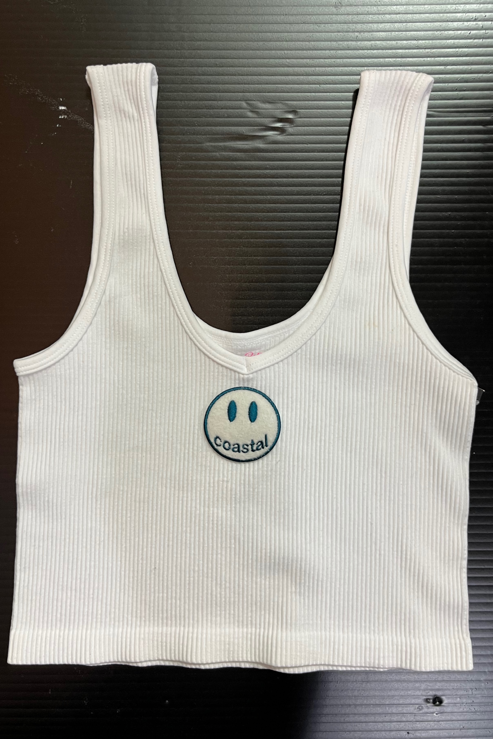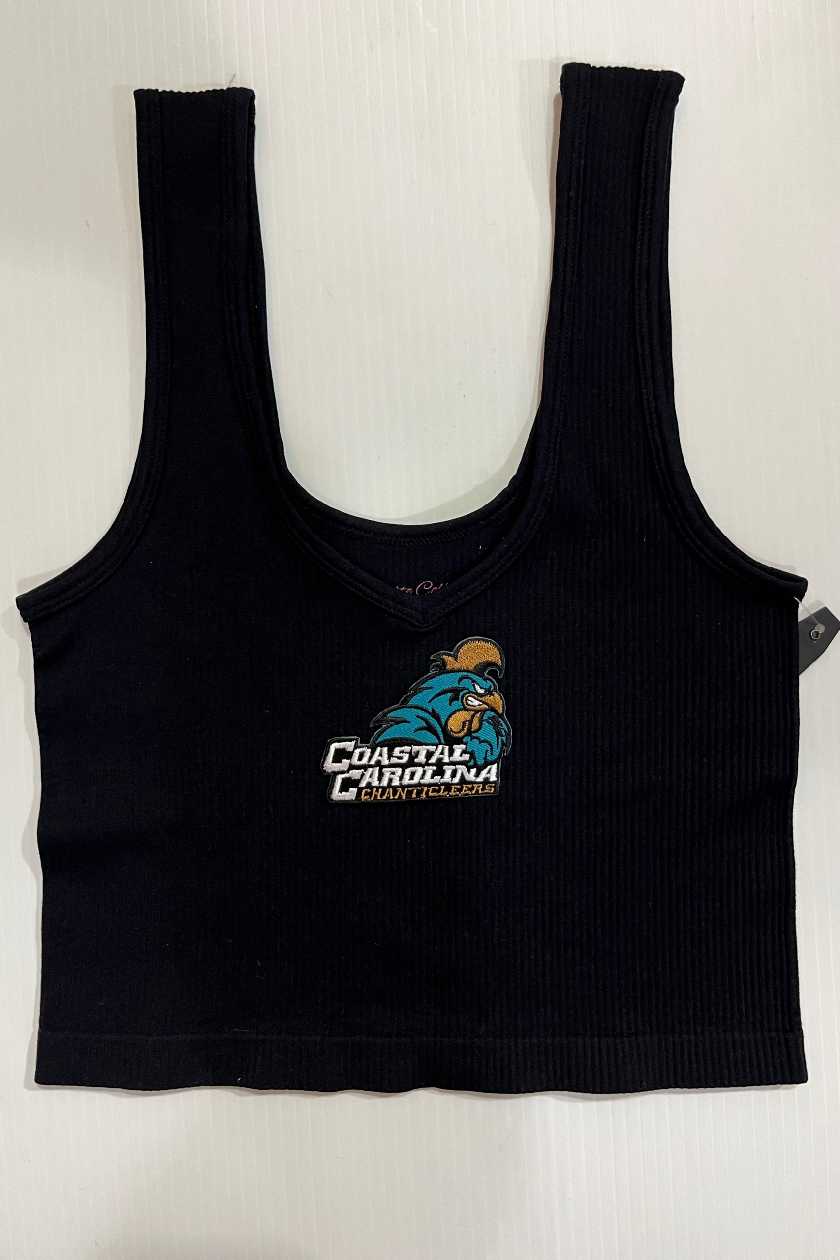 15 inch cropped 1X1 ribbed brami top with the Coastal Carolina logo. 92% Nylon 8% Spandex