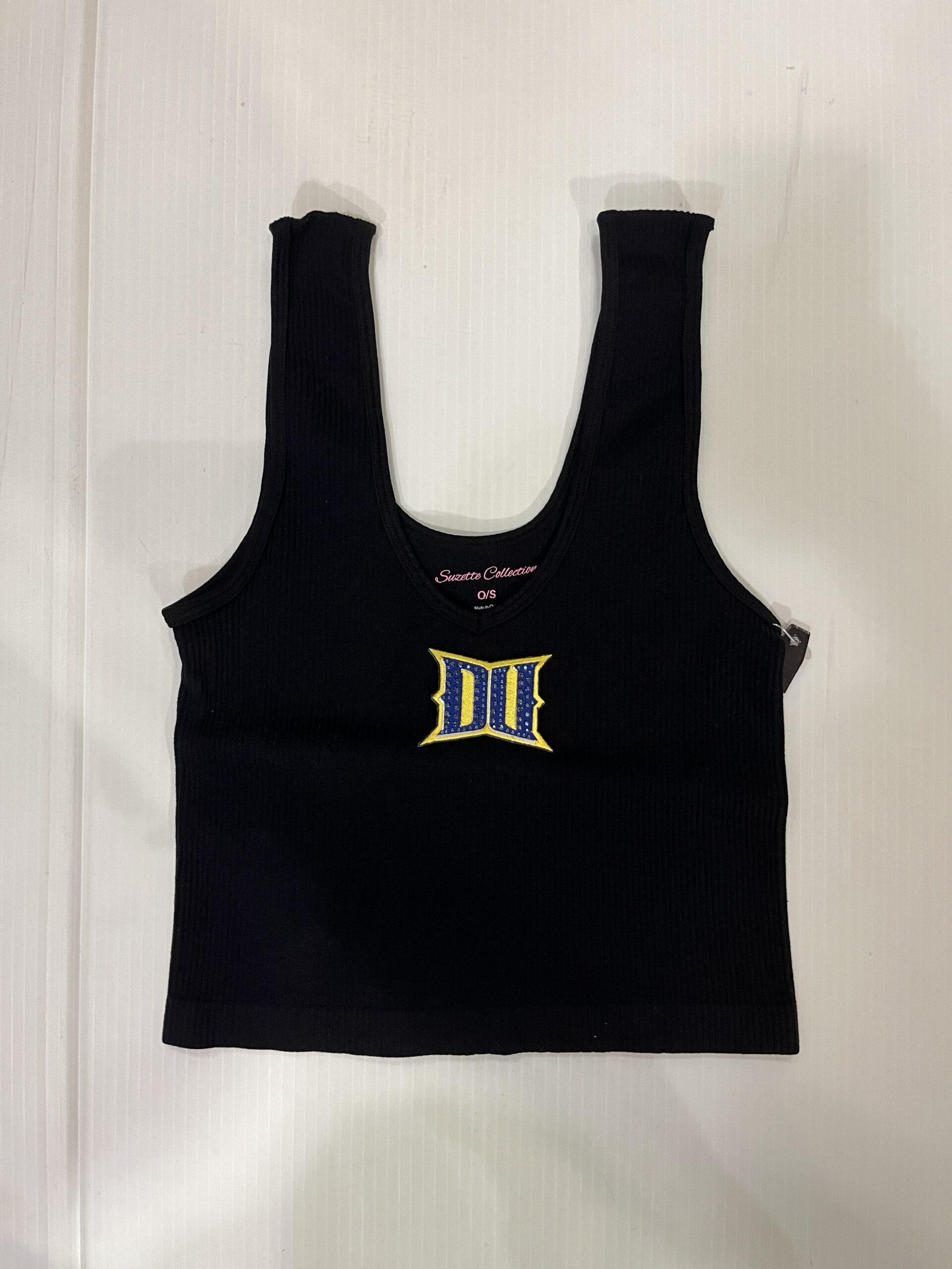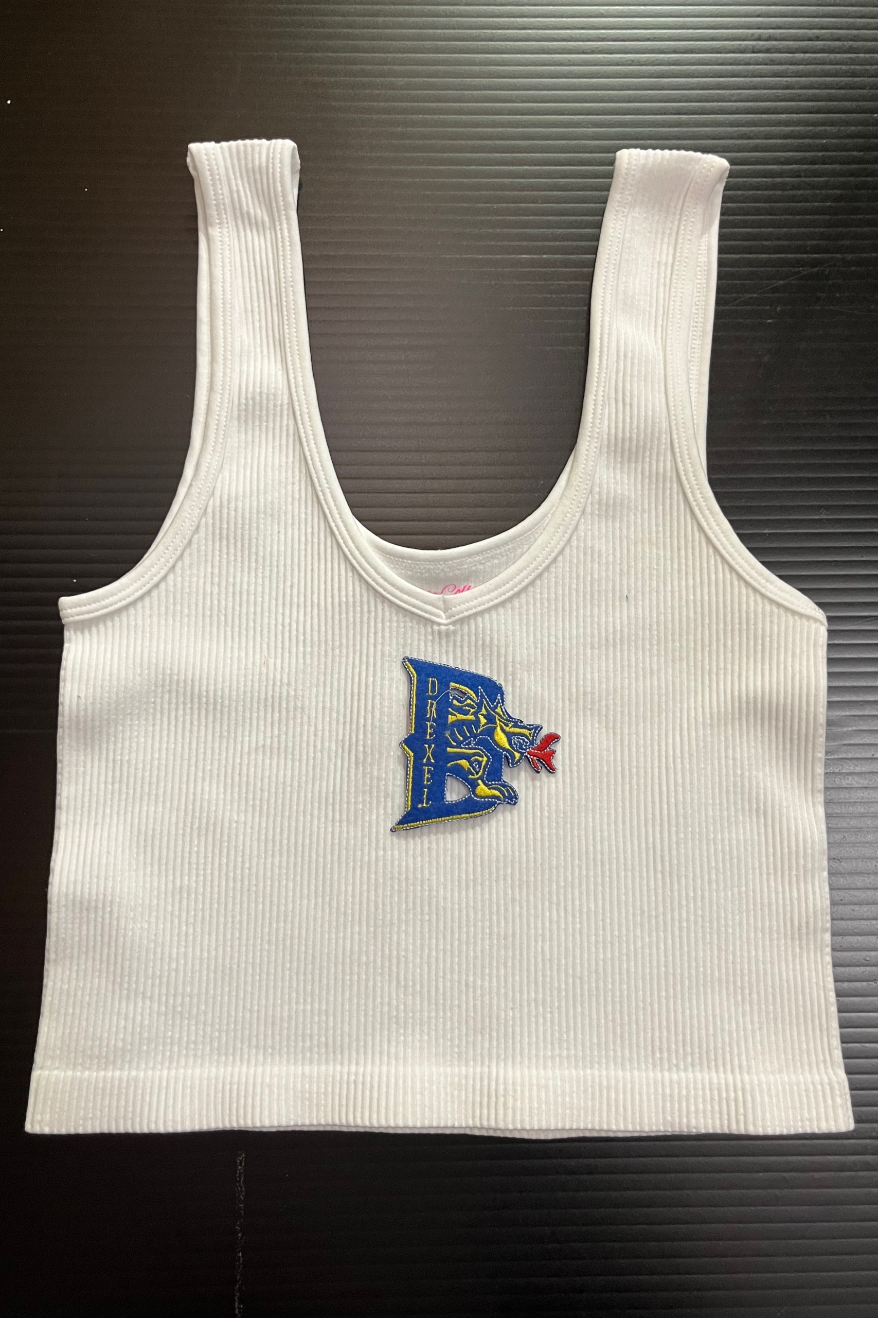 15 inch cropped 1X1 ribbed brami top with the Drexel logo. 92% Nylon 8% Spandex