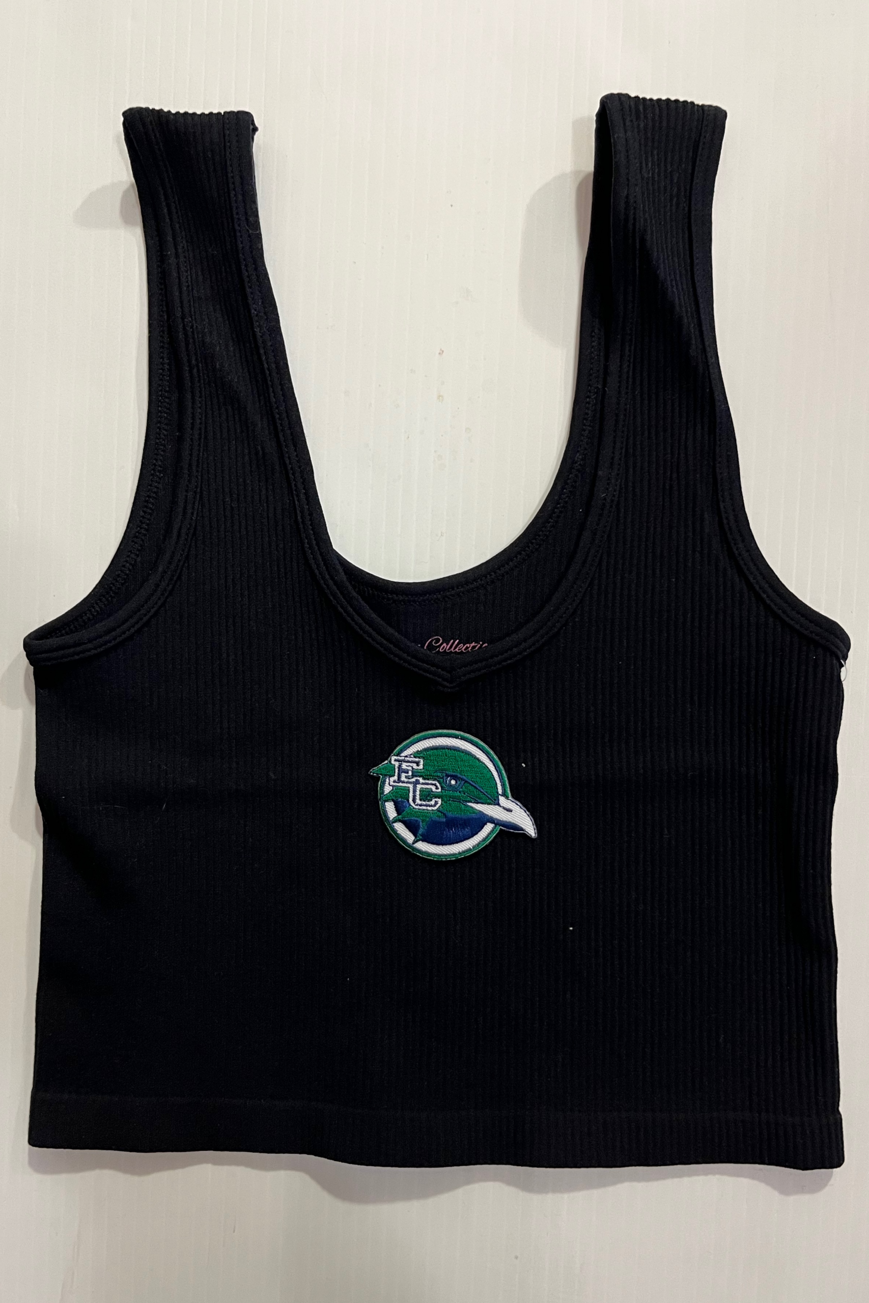 15 inch cropped 1X1 ribbed brami top with the Endicott logo. 92% Nylon 8% Spandex