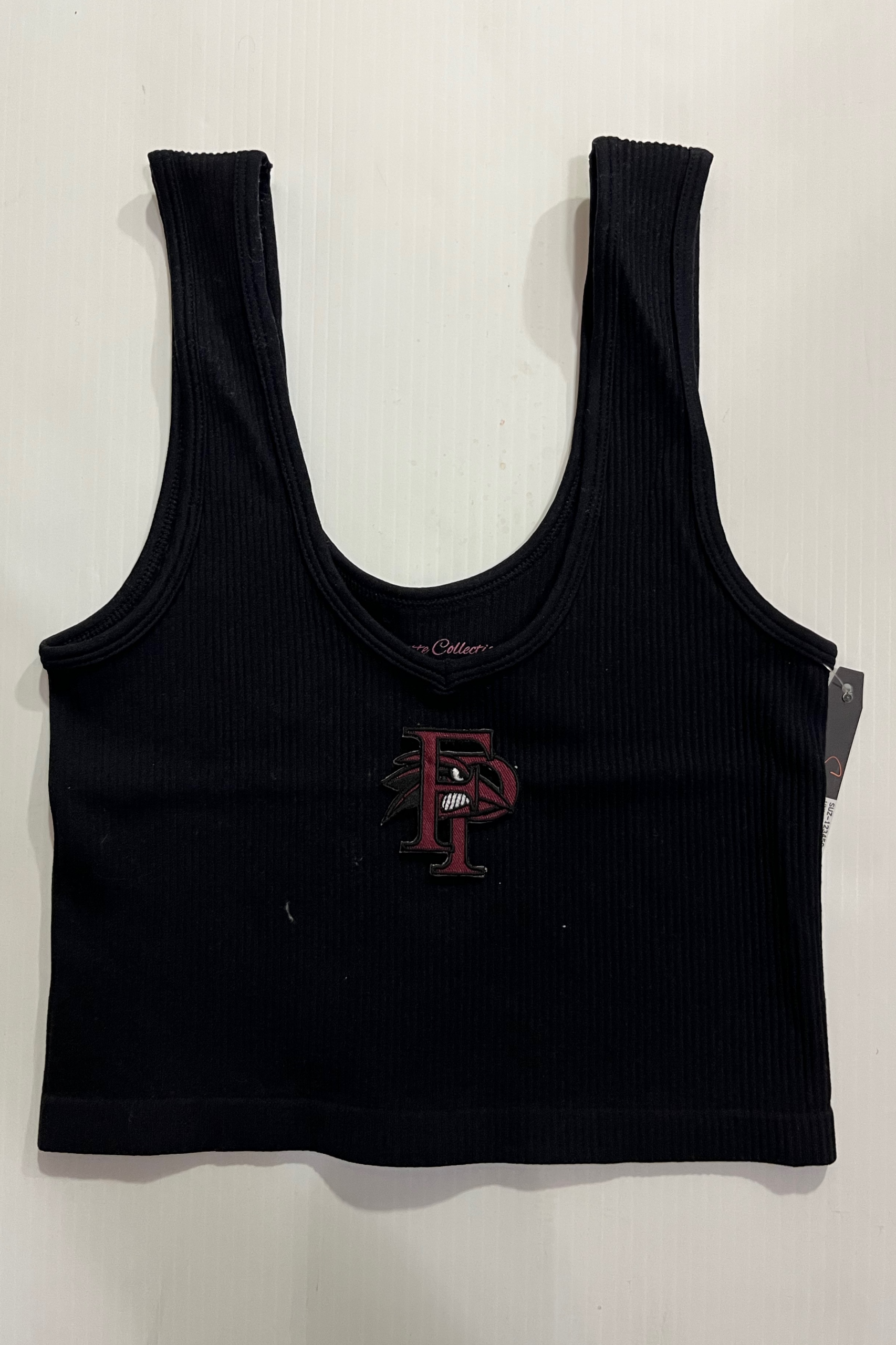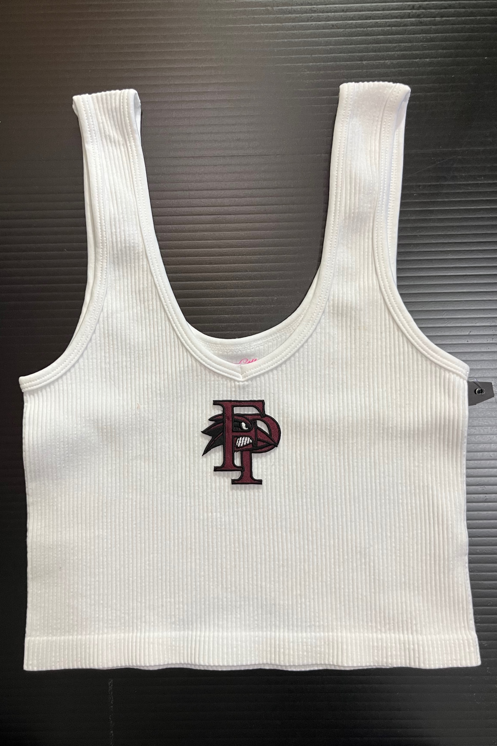 15 inch cropped 1X1 ribbed brami top with the FP logo. 92% Nylon 8% Spandex