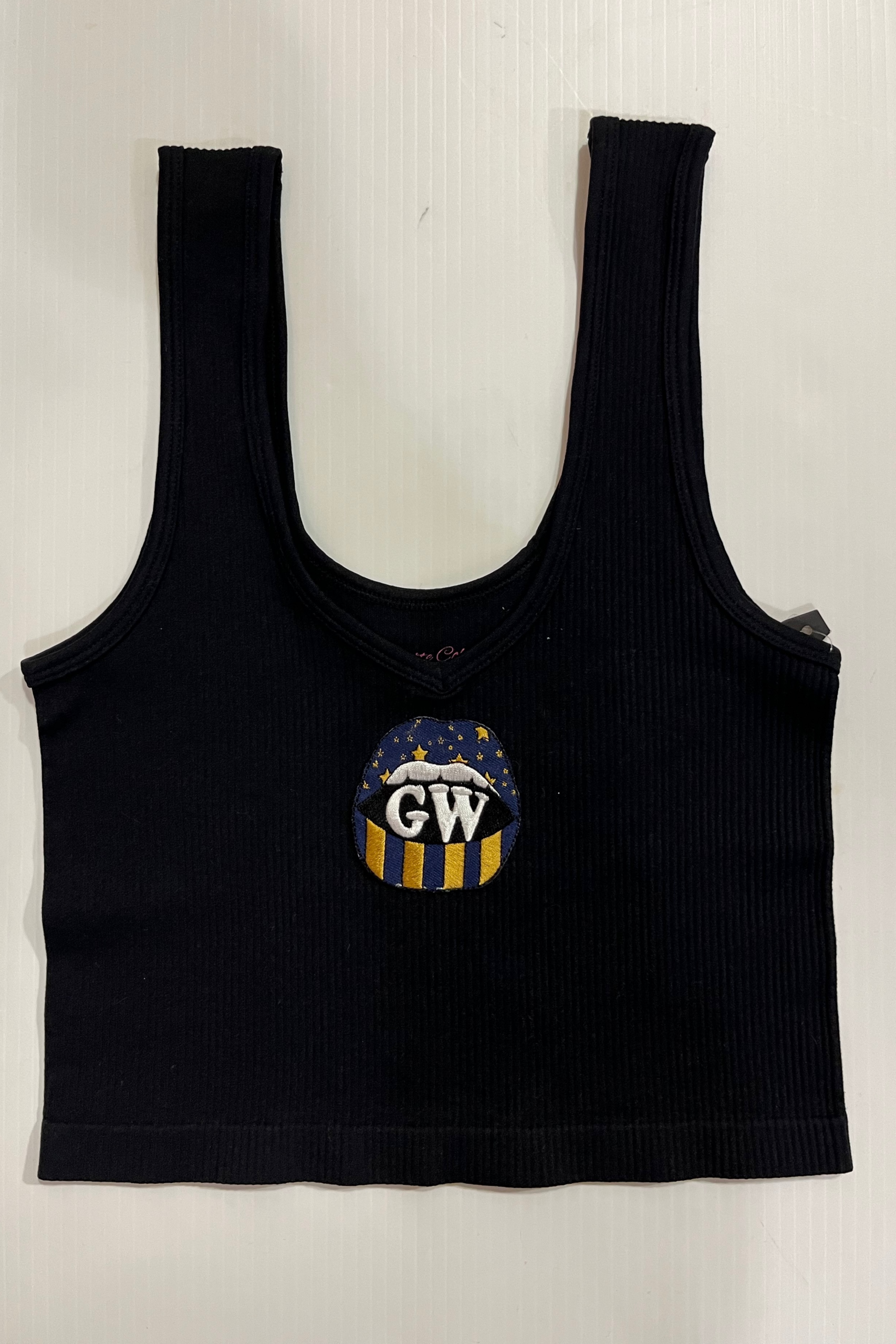15 inch cropped 1X1 ribbed brami top with GW logo. 92% Nylon 8% Spandex