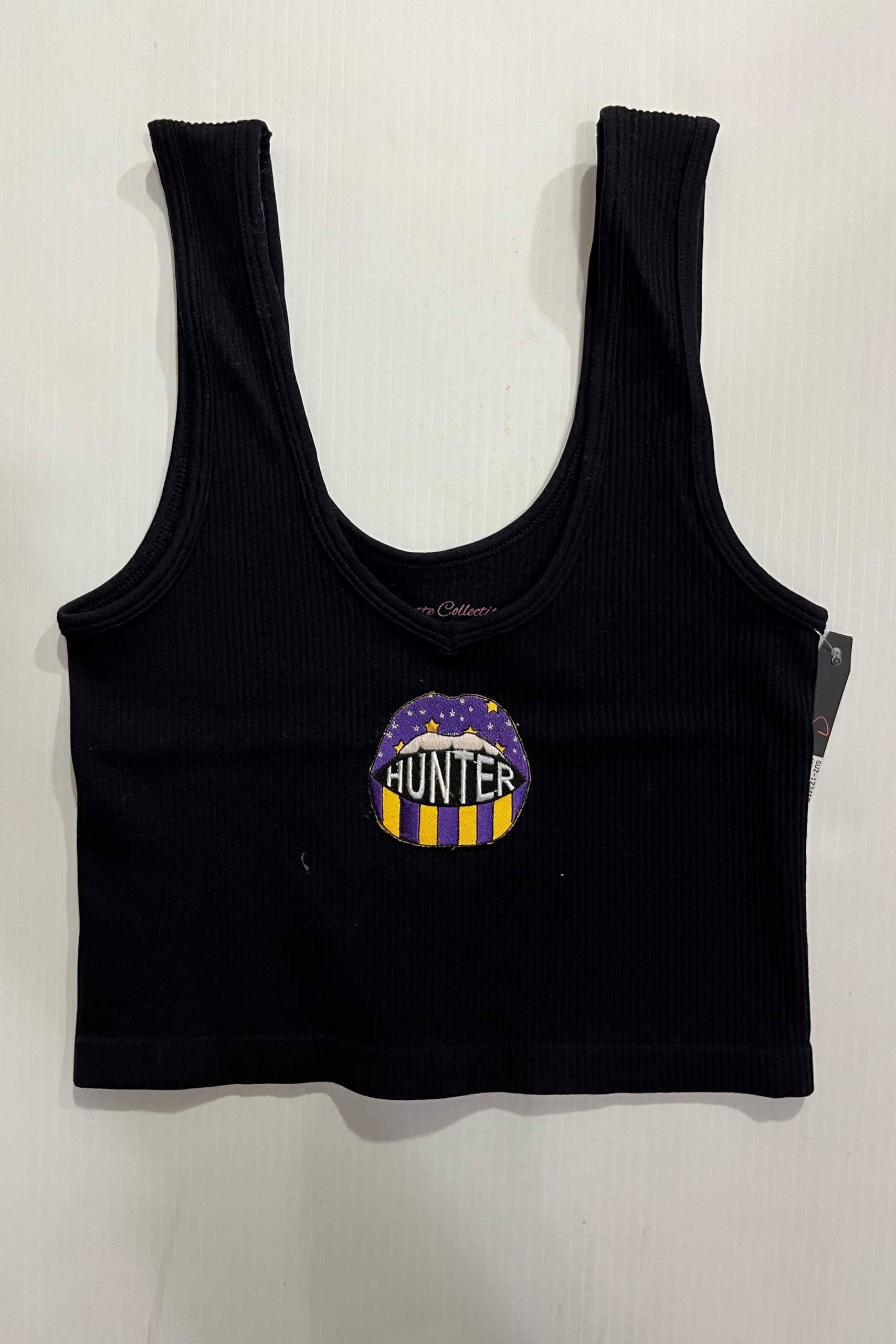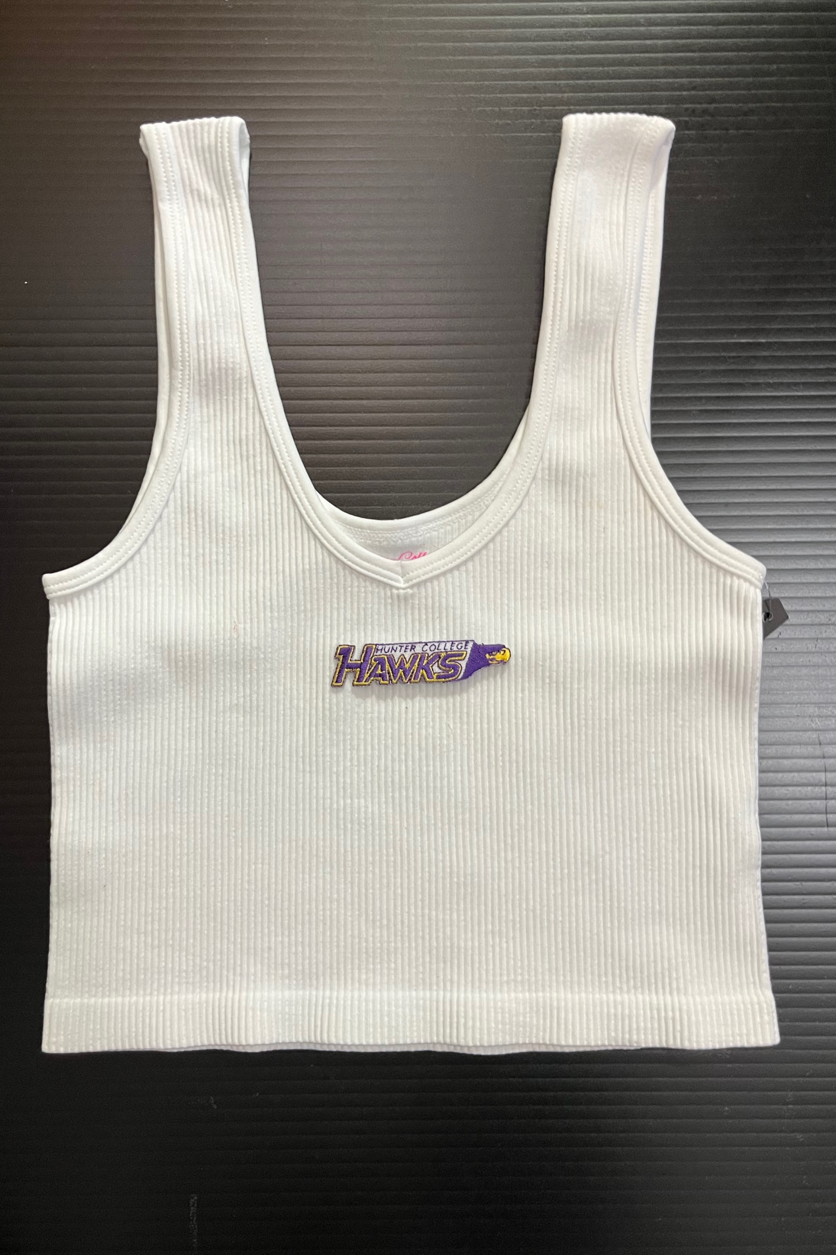 15 inch cropped 1X1 ribbed brami top with the Hunter College logo. 92% Nylon 8% Spandex