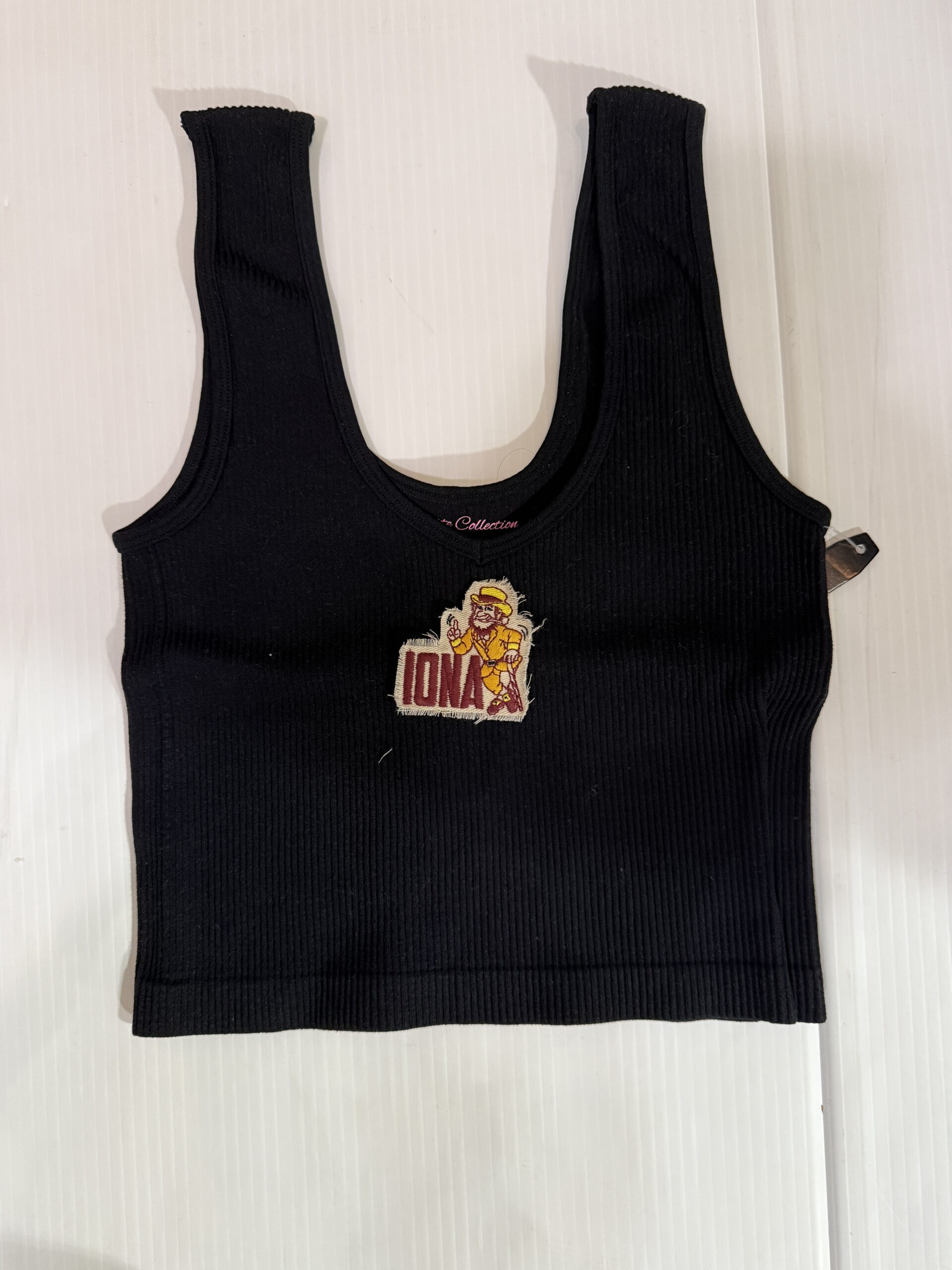 15 inch cropped 1X1 ribbed brami top with the Iona logo. 92% Nylon 8% Spandex