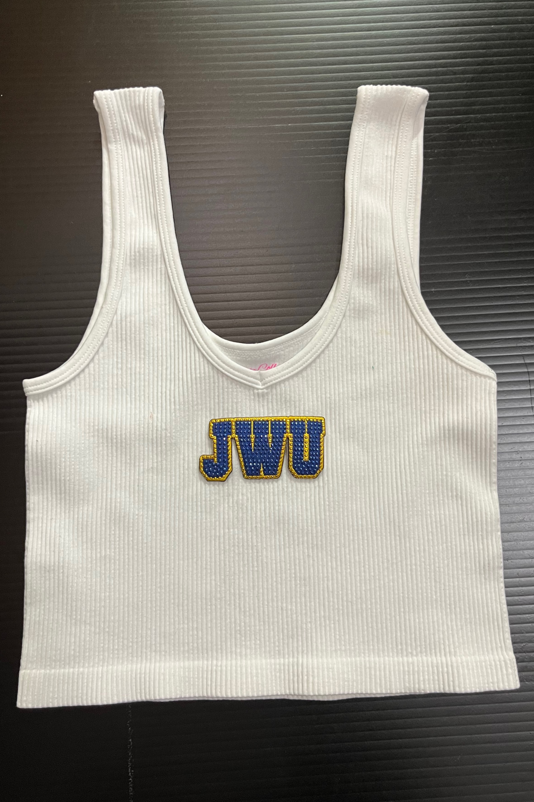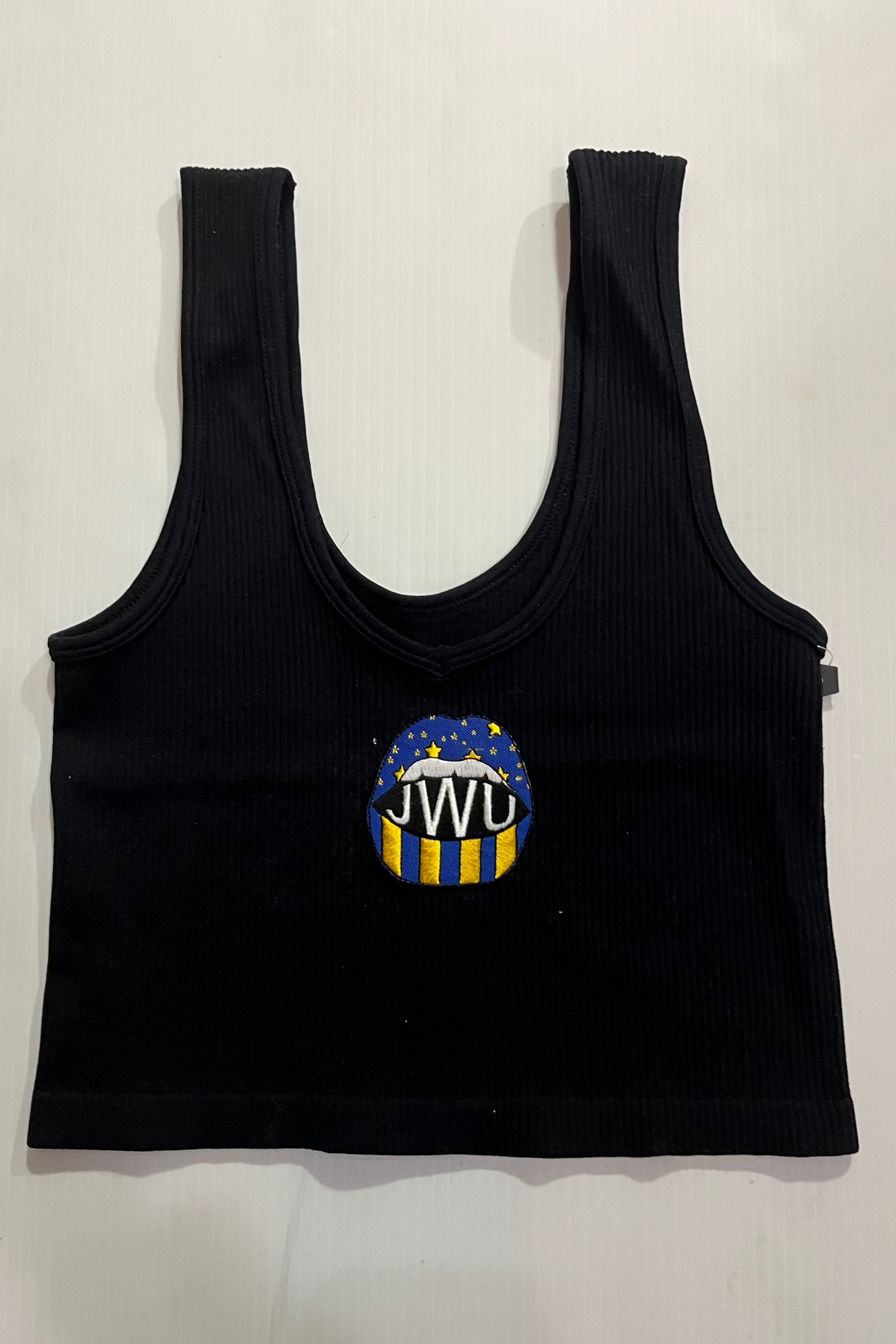 15 inch cropped 1X1 ribbed brami top with the JWU logo. 92% Nylon 8% Spandex