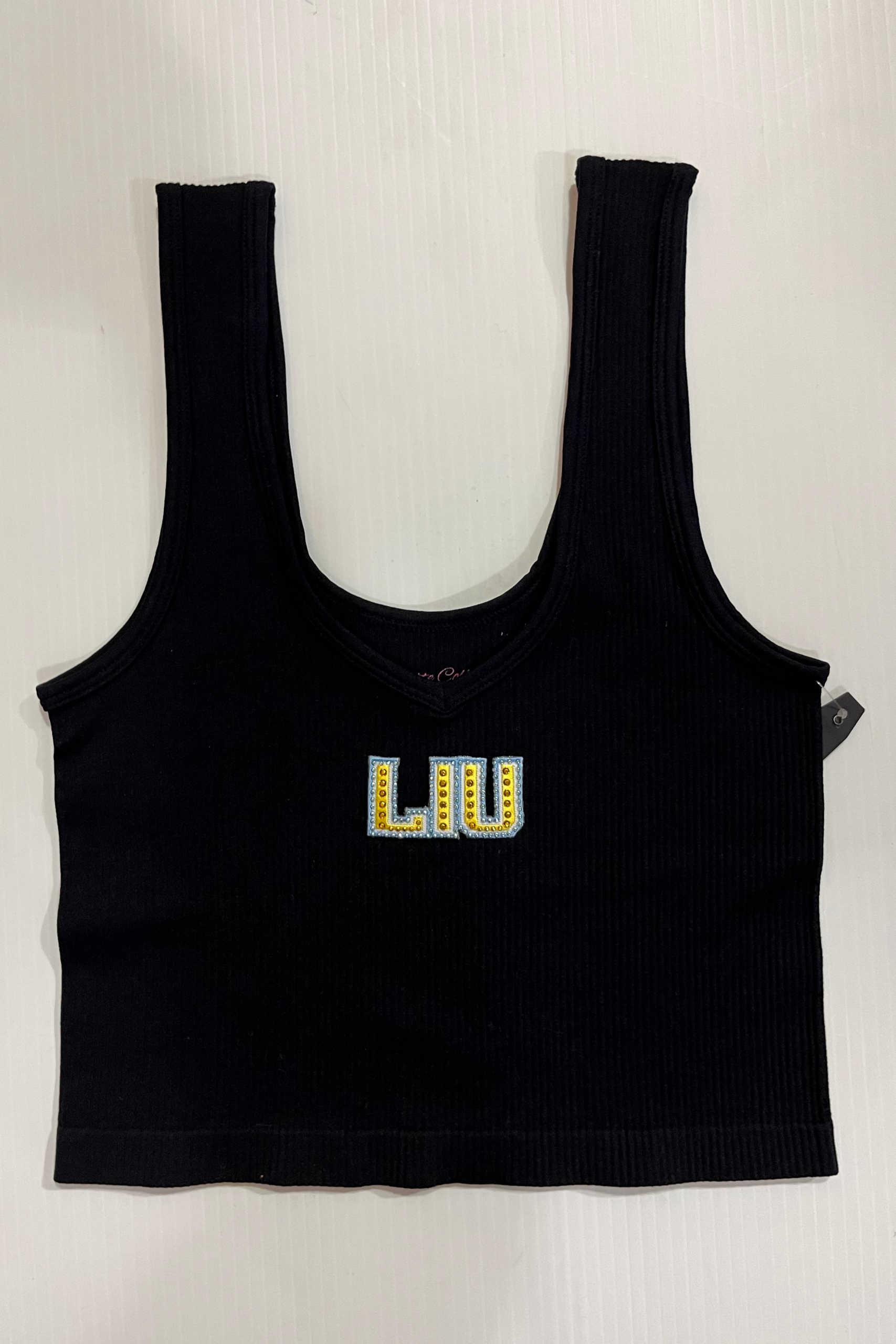 15 inch cropped 1X1 ribbed brami top with the LIU logo. 92% Nylon 8% Spandex