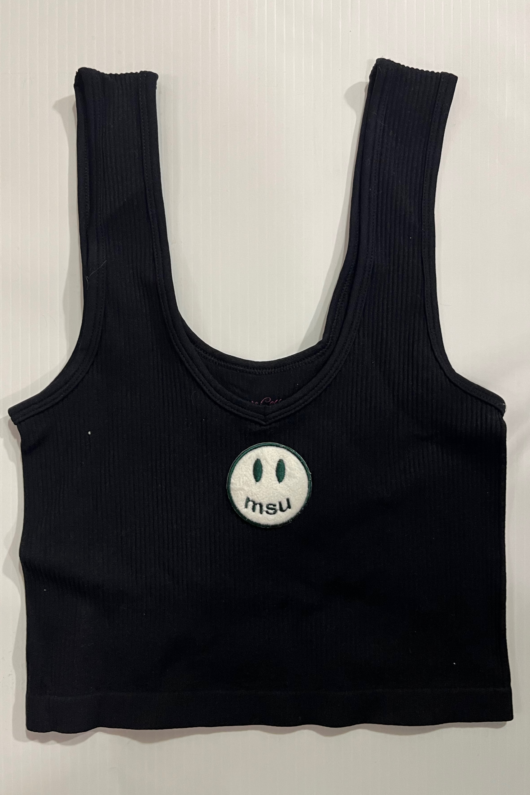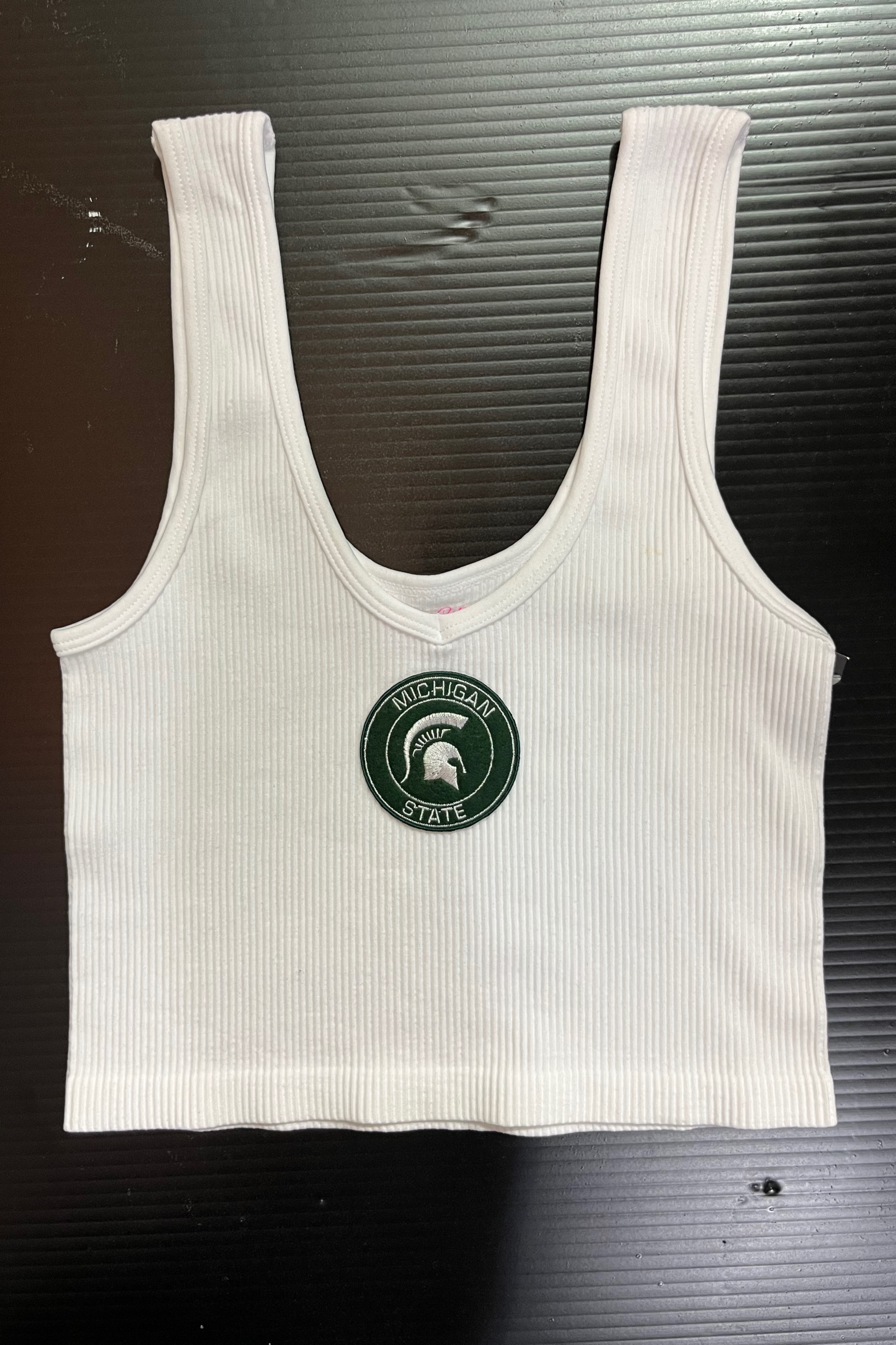 15 inch cropped 1X1 ribbed brami top with the Michigan State logo. 92% Nylon 8% Spandex