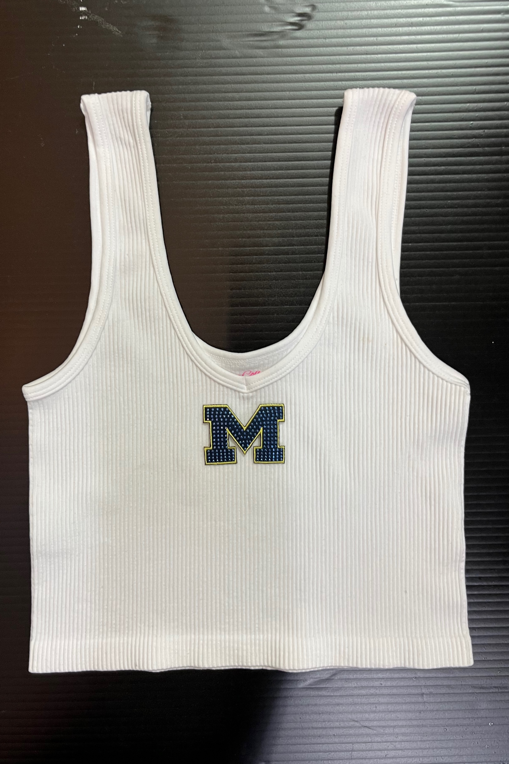 15 inch cropped 1X1 ribbed brami top with Michigan logo. 92% Nylon 8% Spandex