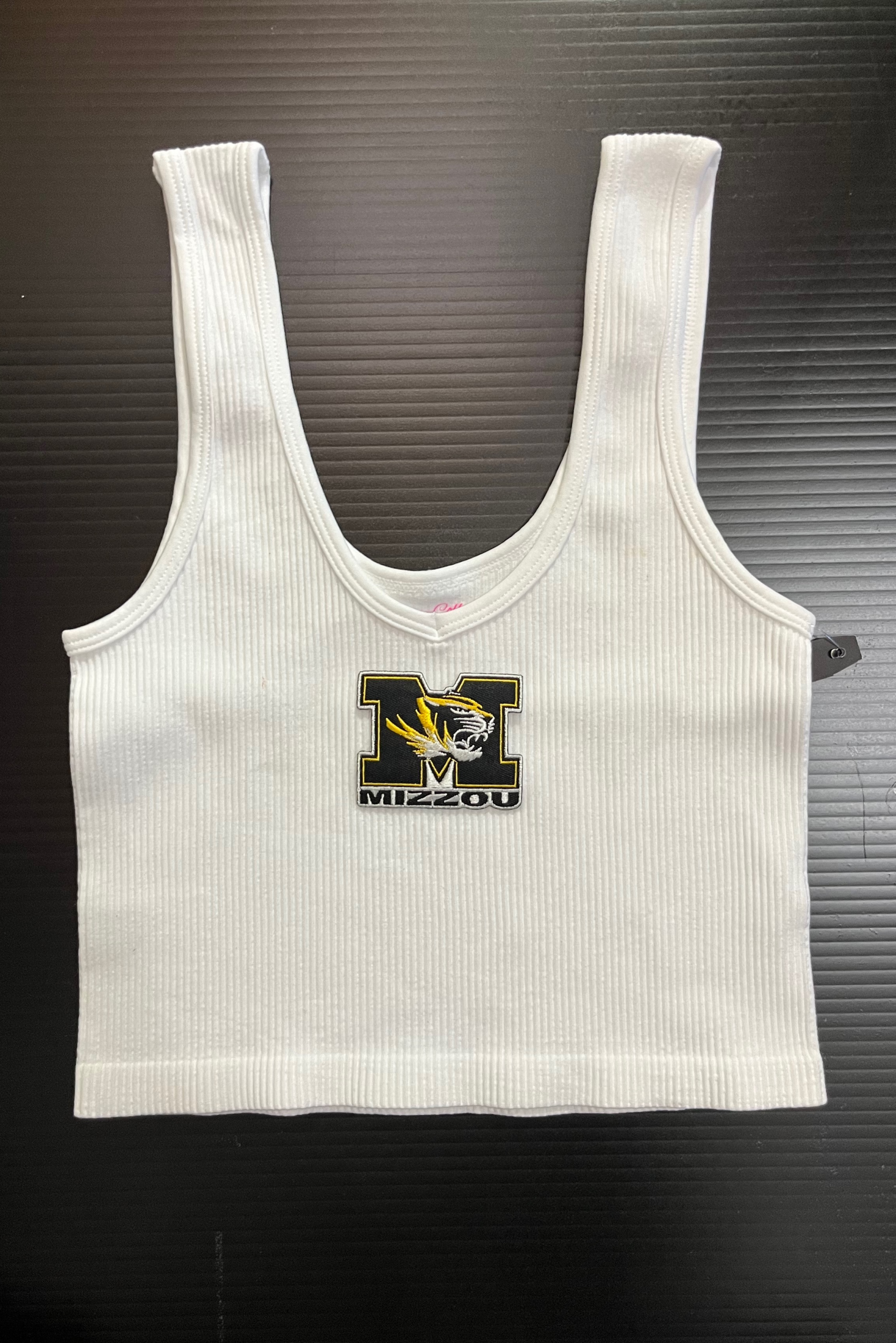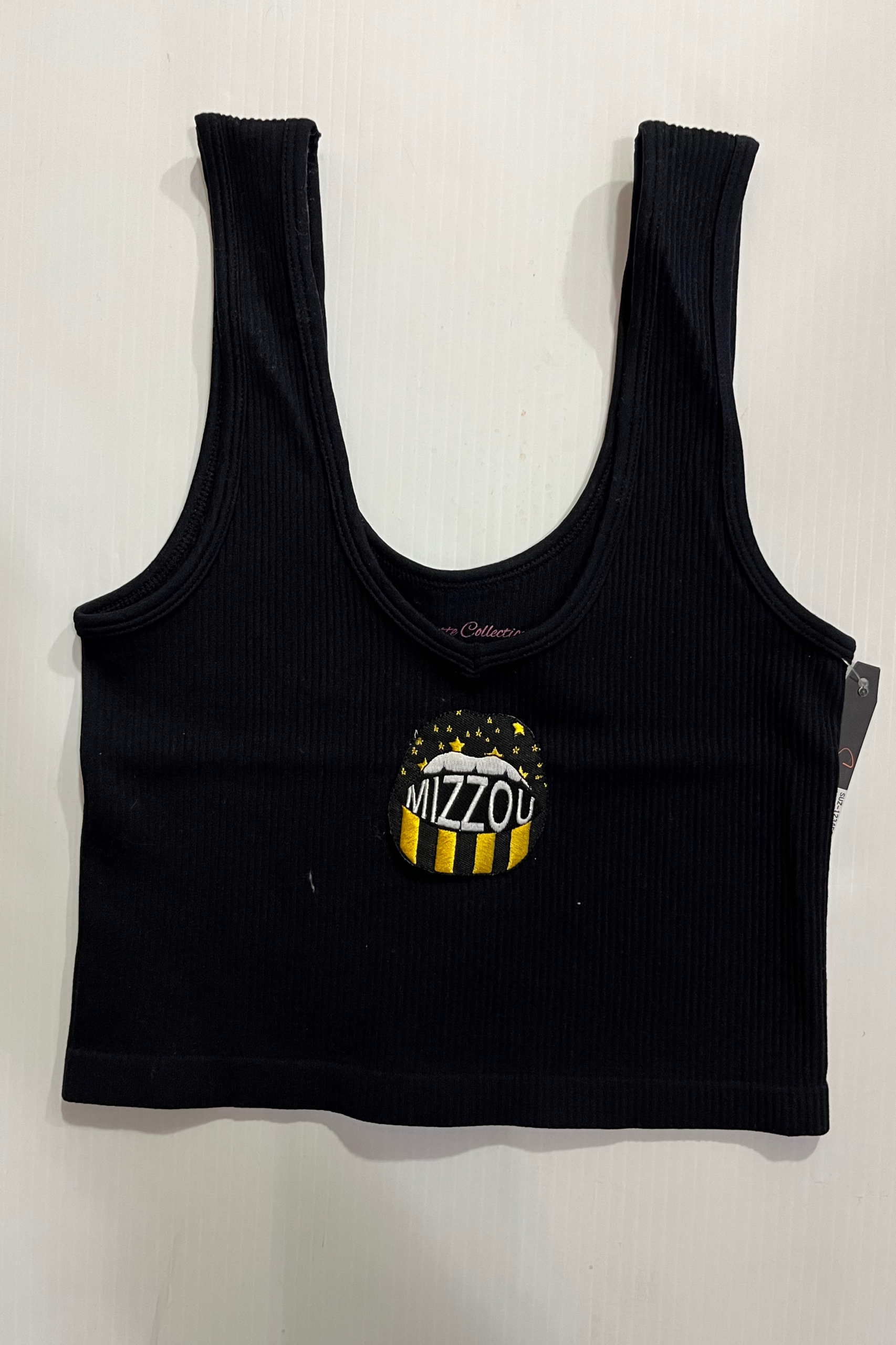 15 inch cropped 1X1 ribbed brami top with the Mizzou logo. 92% Nylon 8% Spandex
