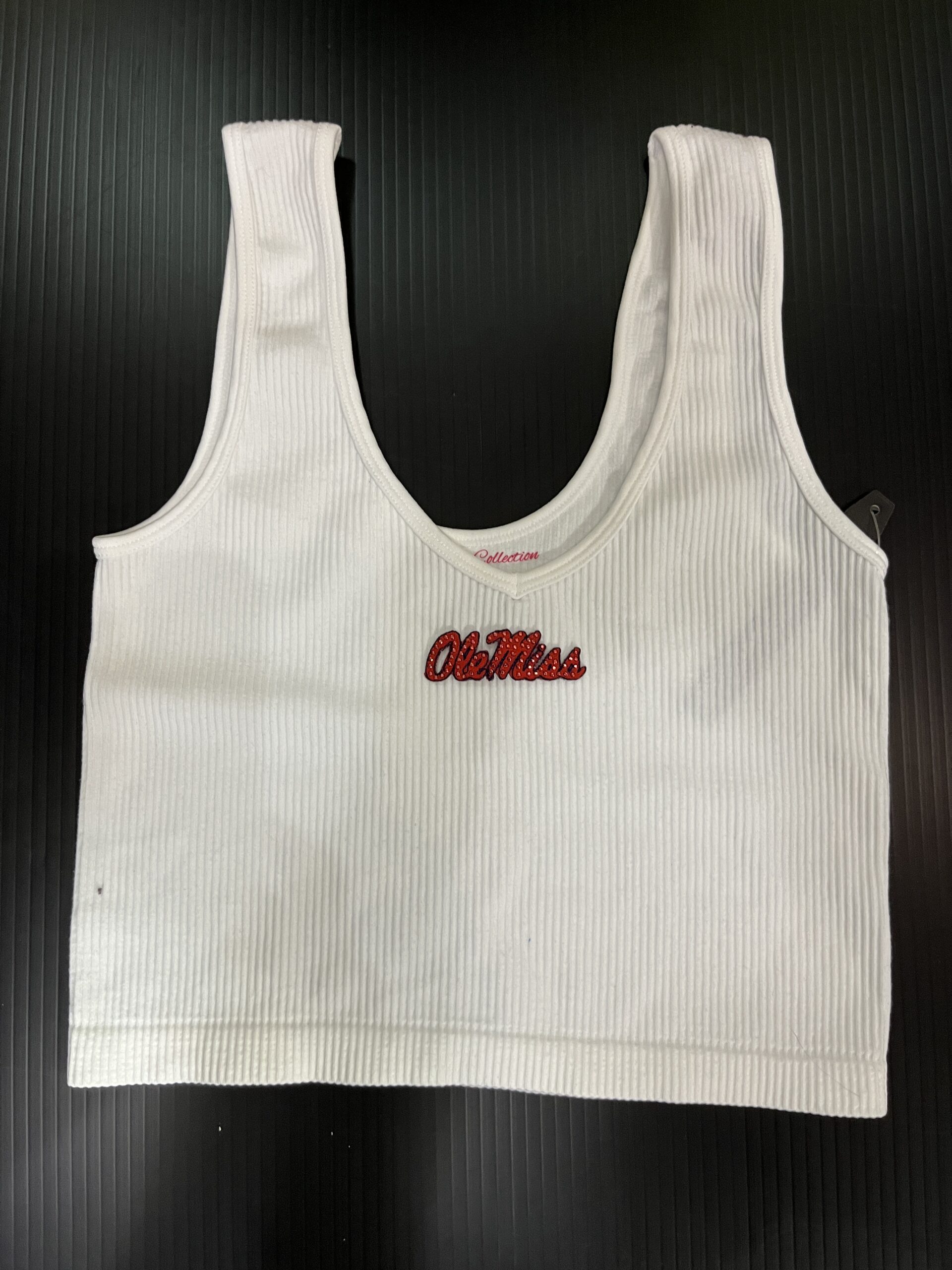 15 inch cropped 1X1 ribbed brami top with the Ole Miss logo. 92% Nylon 8% Spandex