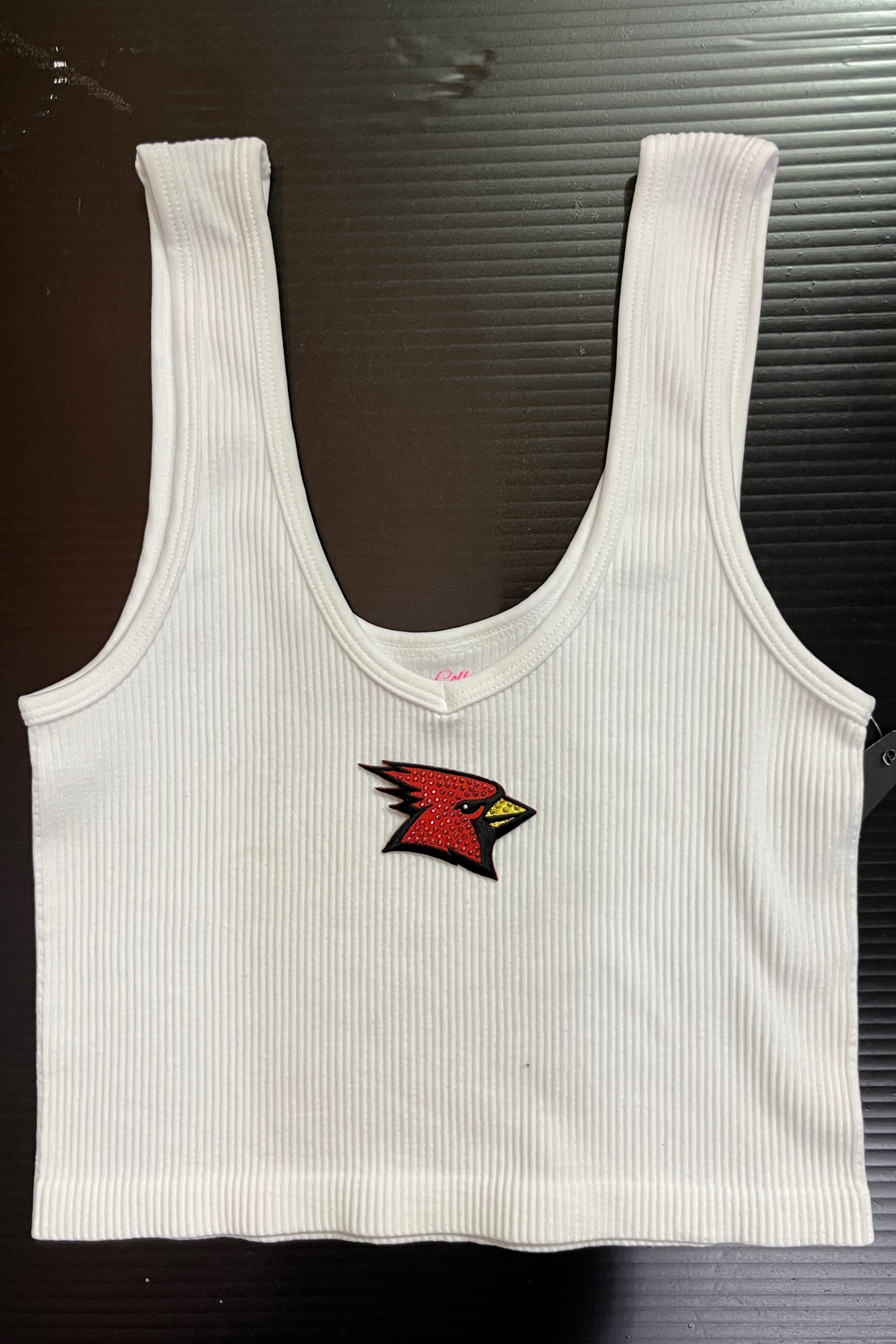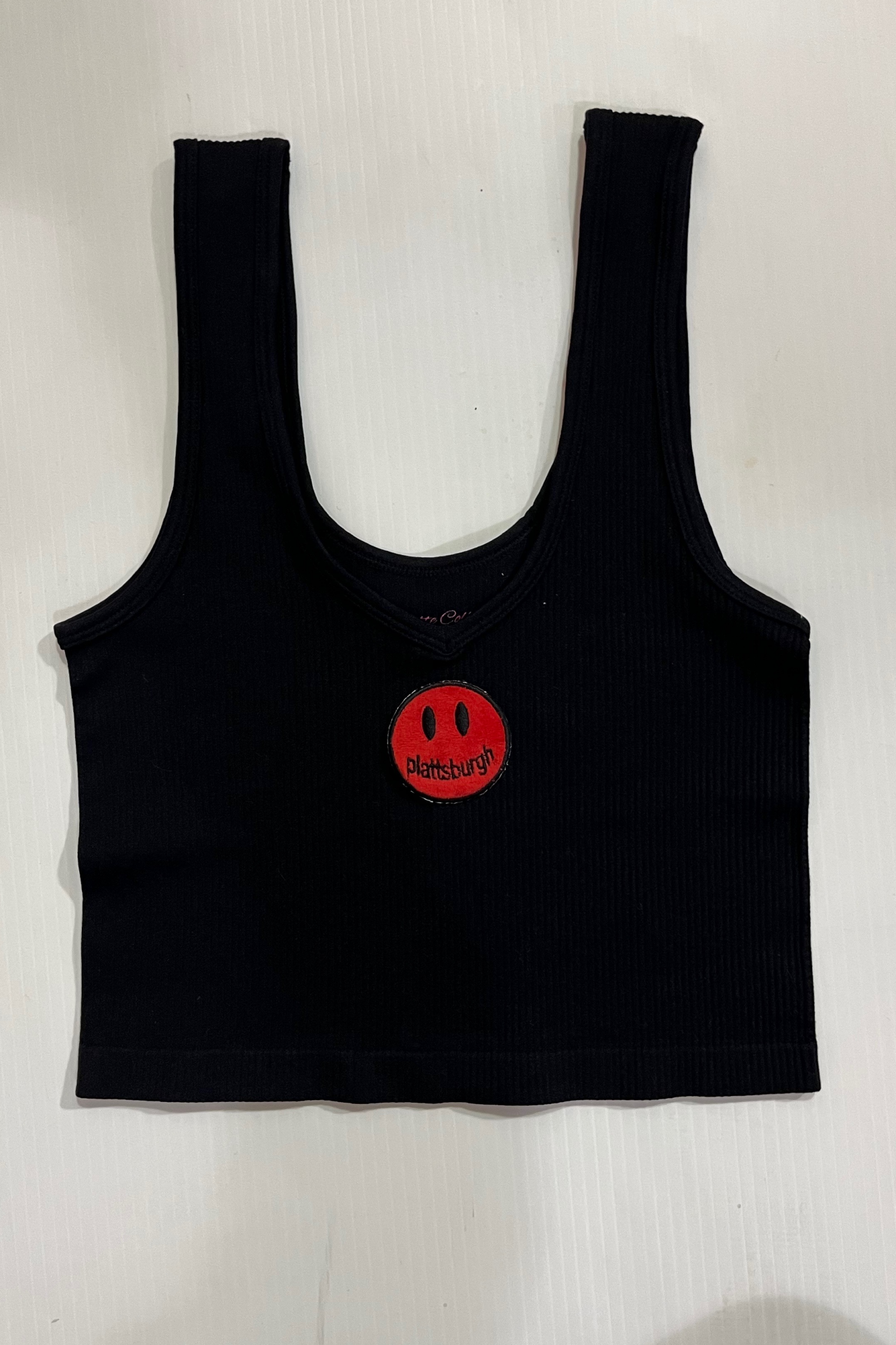 15 inch cropped 1X1 ribbed brami top with SUNY Plattsburgh logo. 92% Nylon 8% Spandex