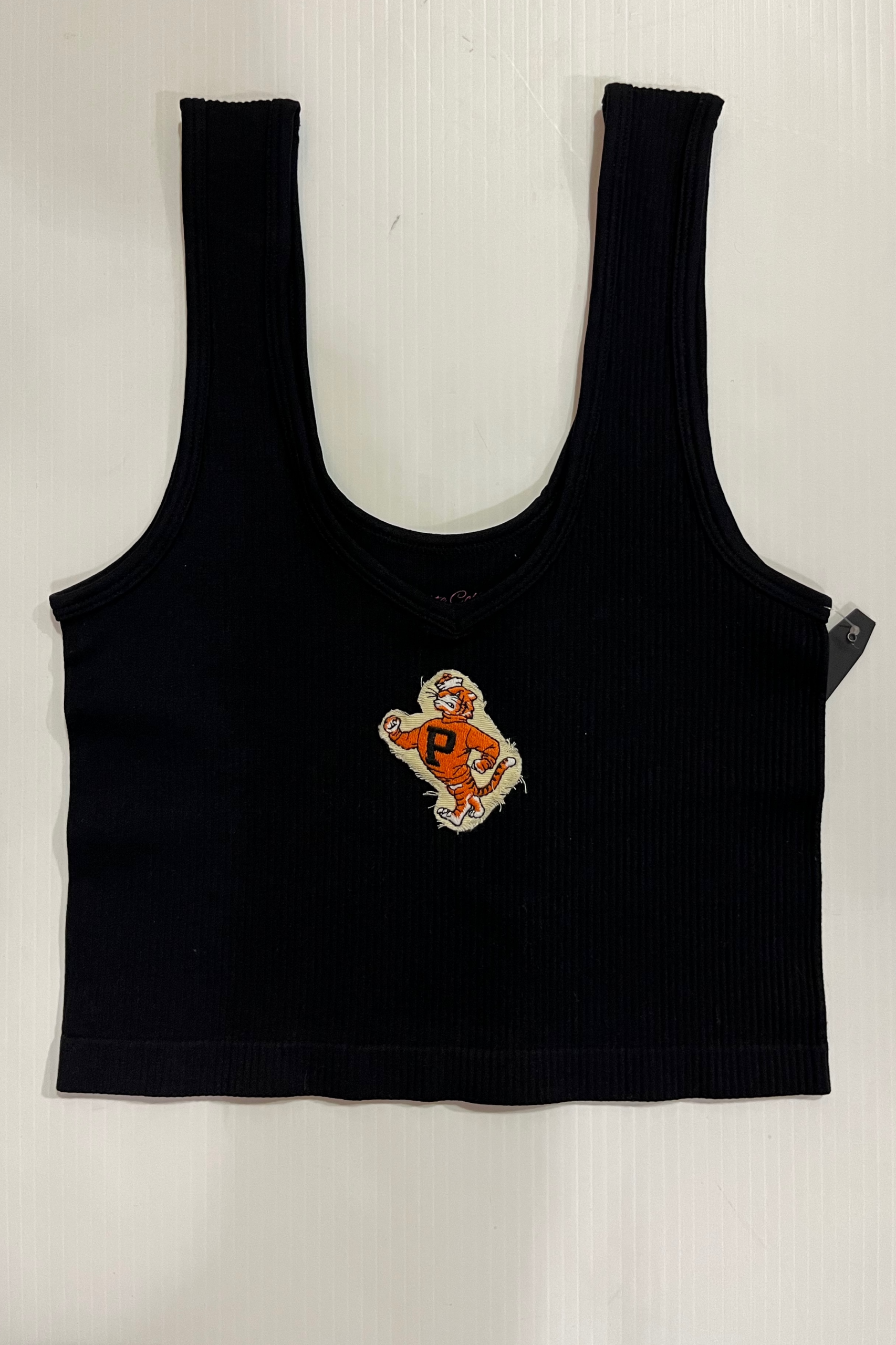 15 inch cropped 1X1 ribbed brami top with the Princeton logo. 92% Nylon 8% Spandex