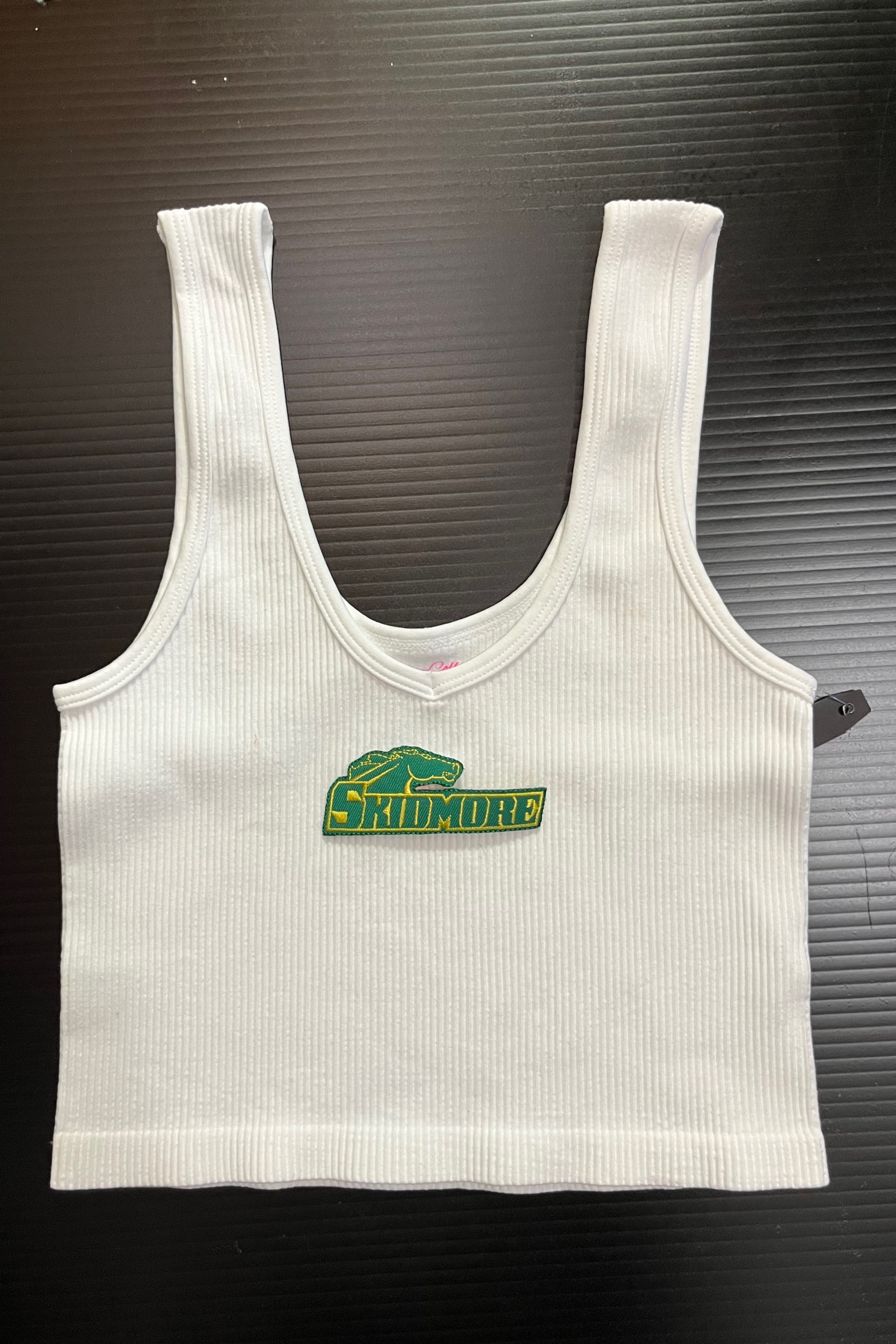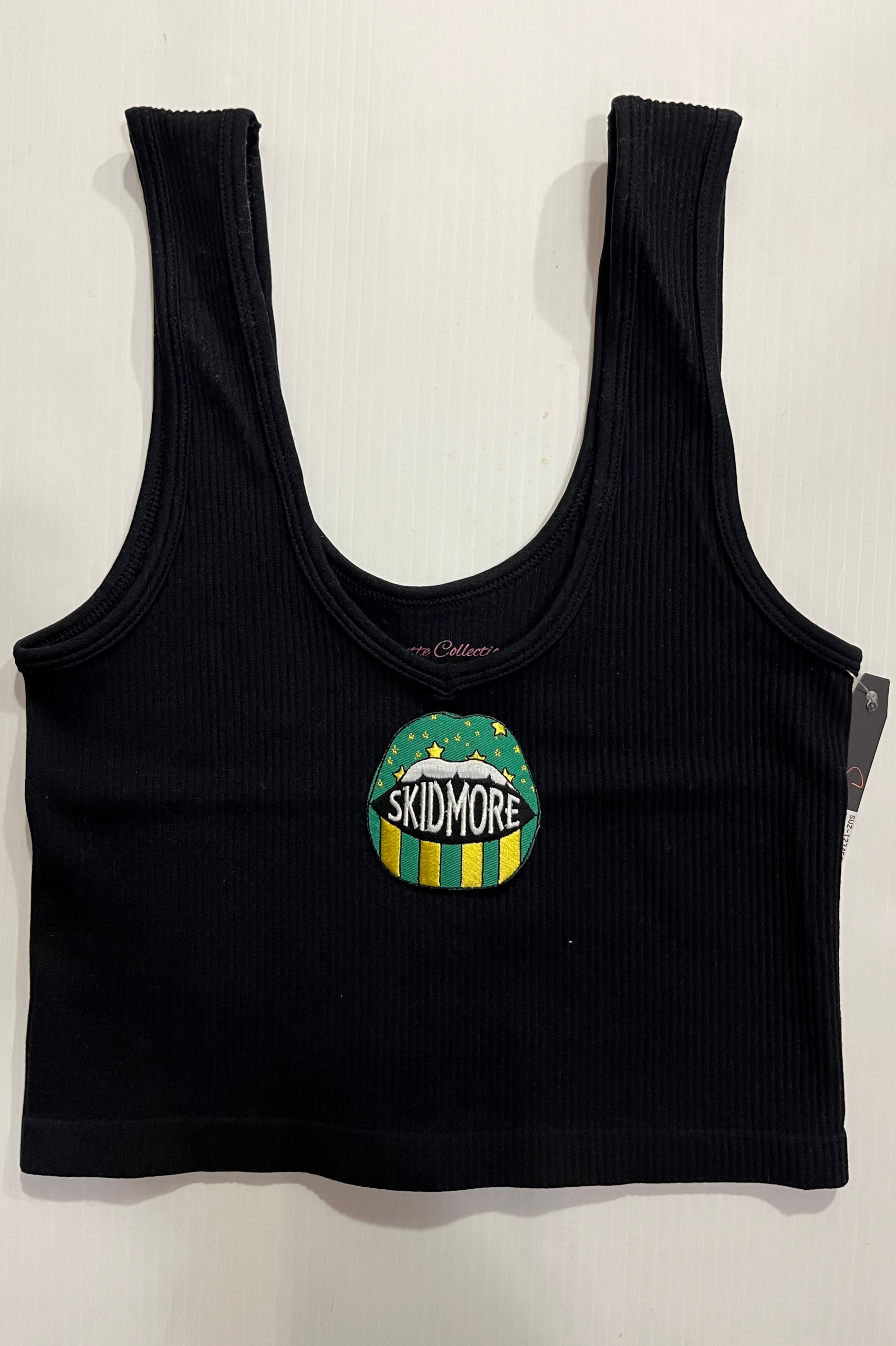 15 inch cropped 1X1 ribbed brami top with the Skidmore logo. 92% Nylon 8% Spandex