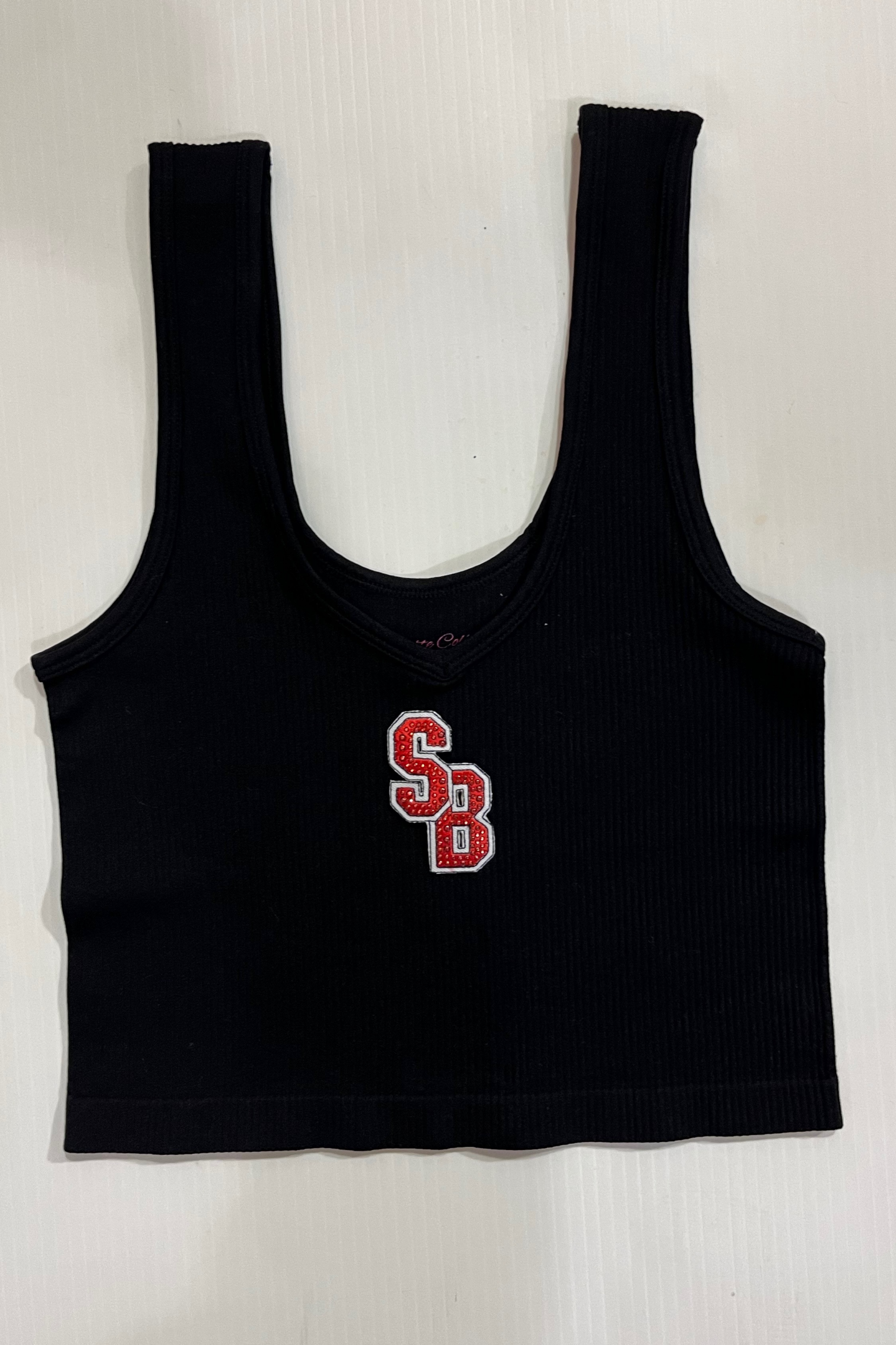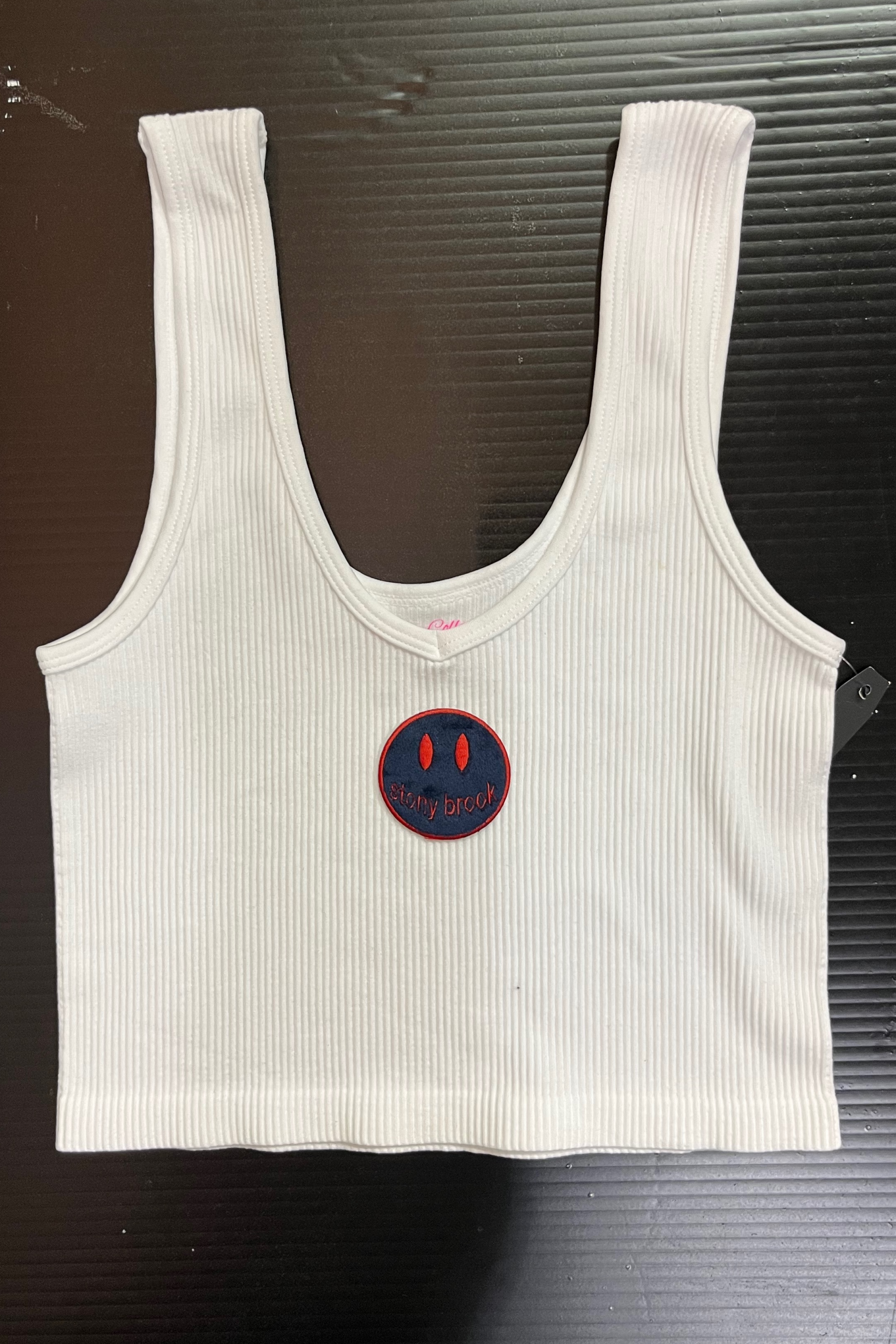 15 inch cropped 1X1 ribbed brami top with Stony Brook logo. 92% Nylon 8% Spandex