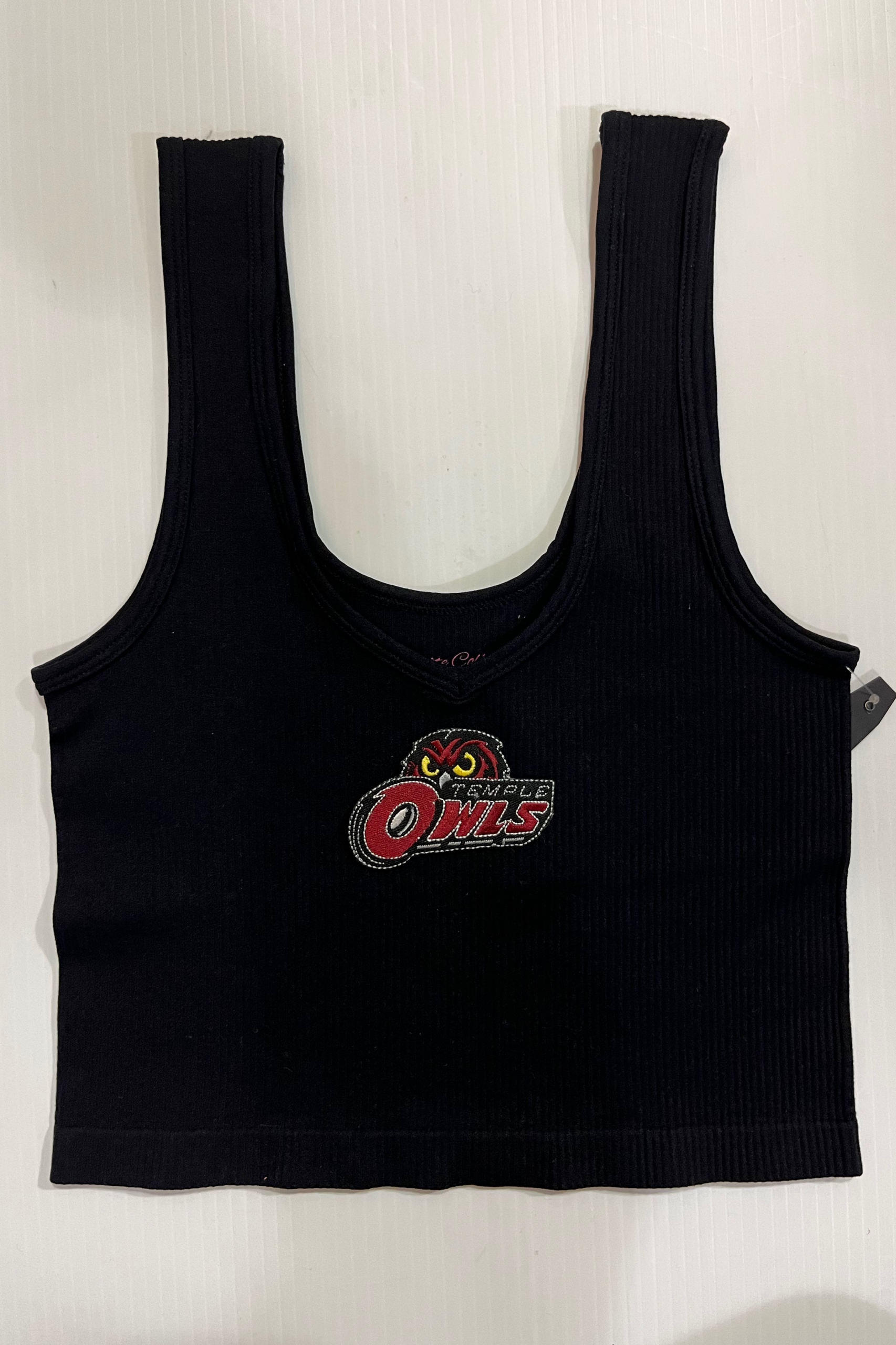 15 inch cropped 1X1 ribbed brami top with the Temple logo. 92% Nylon 8% Spandex