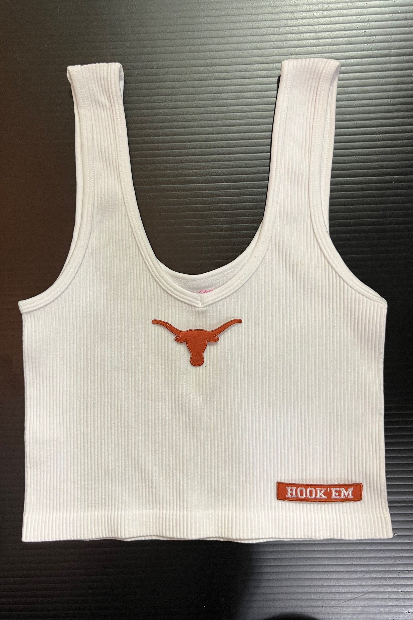 15 inch cropped 1X1 ribbed brami top with the UT logo. 92% Nylon 8% Spandex