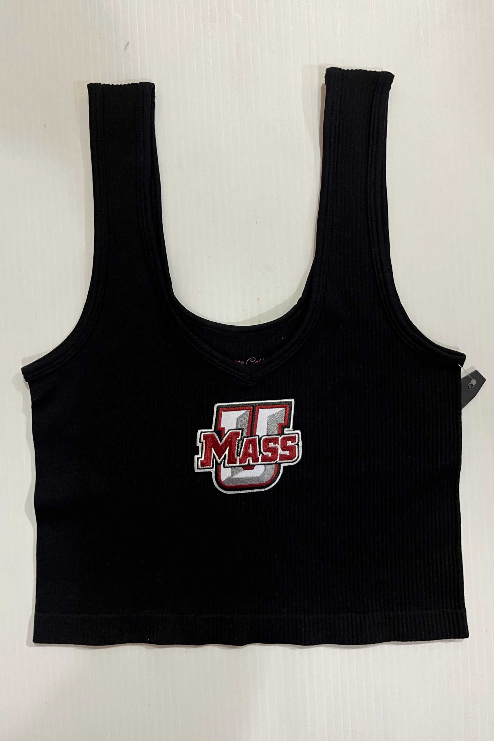 15 inch cropped 1X1 ribbed brami top with the UMass logo. 92% Nylon 8% Spandex