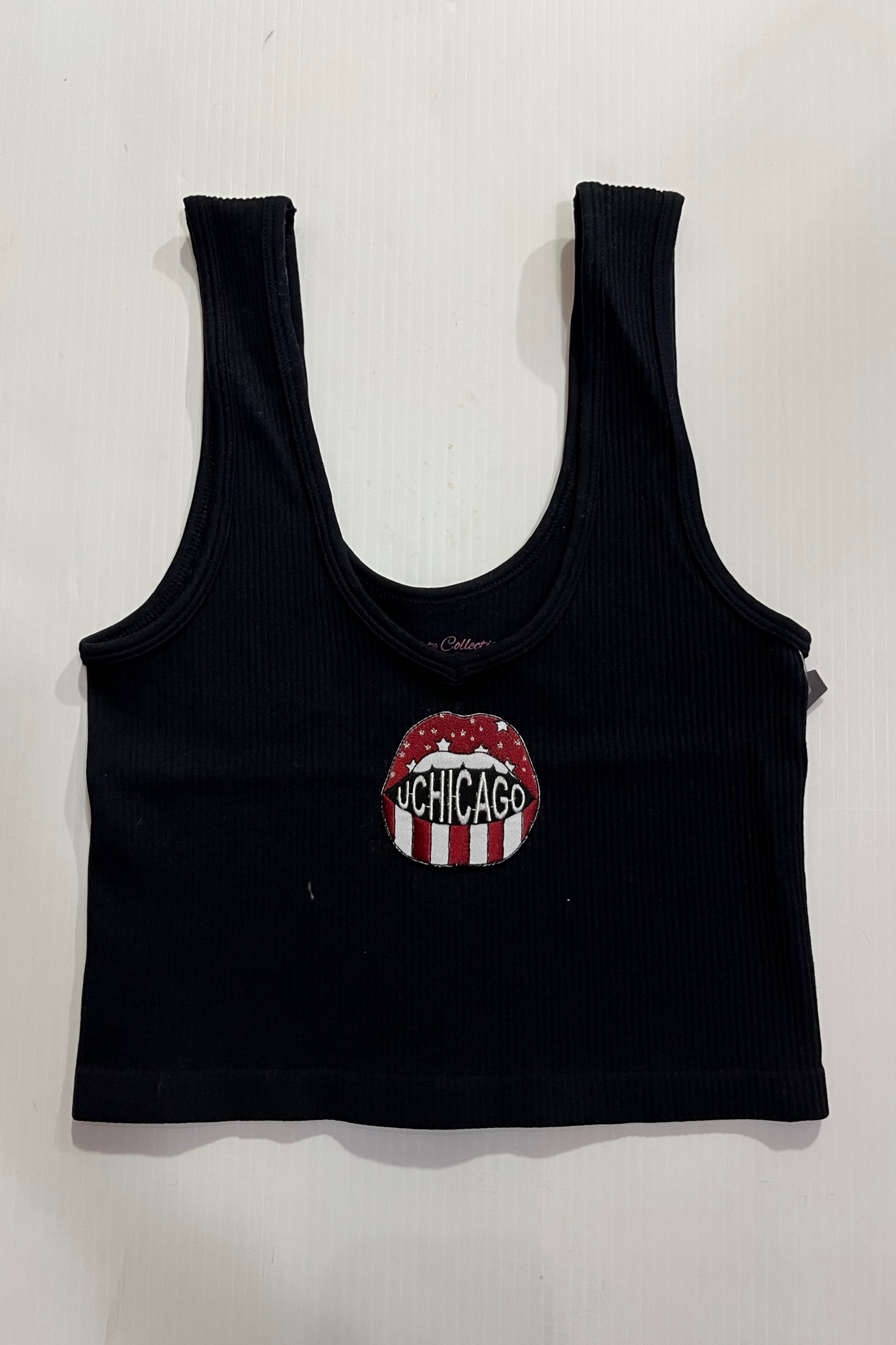 15 inch cropped 1X1 ribbed brami top with the Univeristy of Chicago logo. 92% Nylon 8% Spandex
