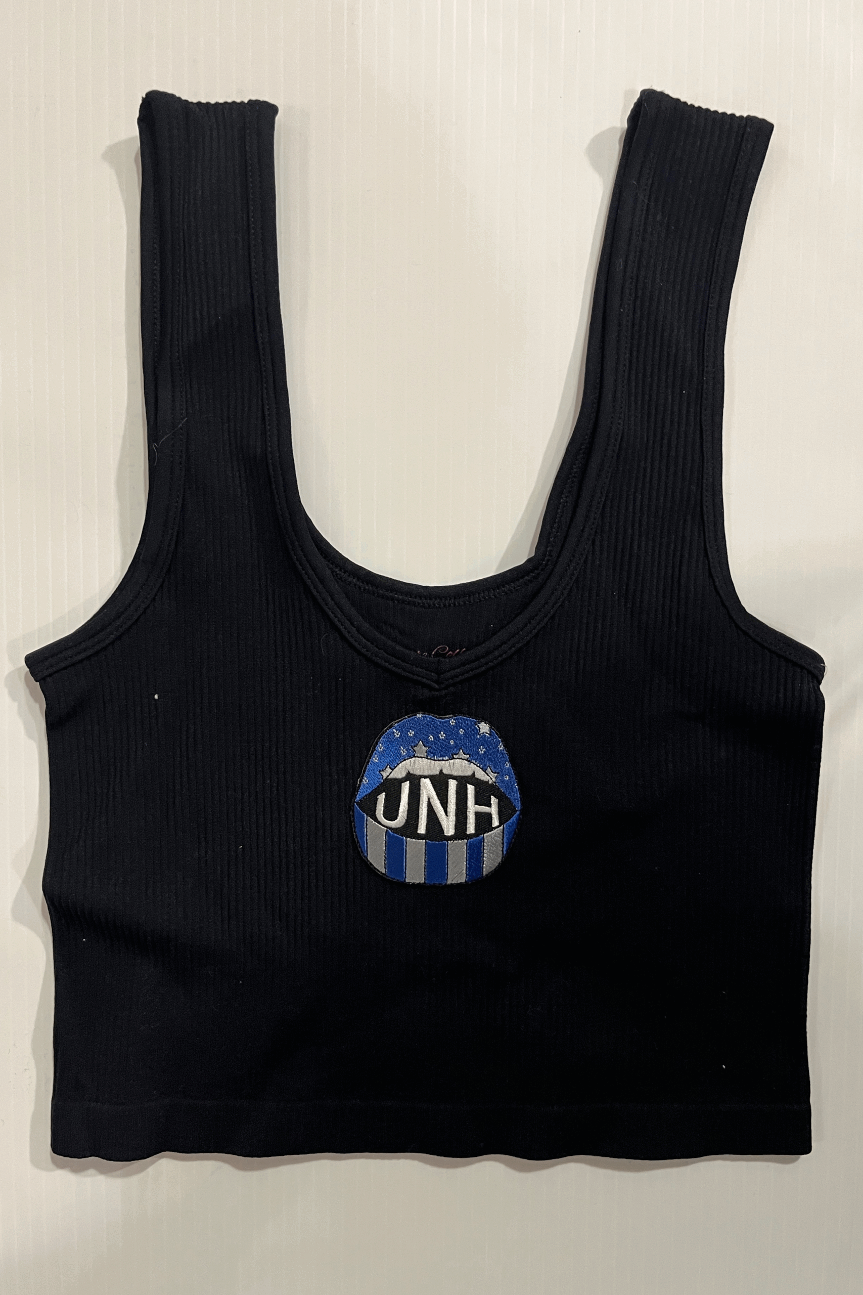 15 inch cropped 1X1 ribbed brami top with the UNH logo. 92% Nylon 8% Spandex