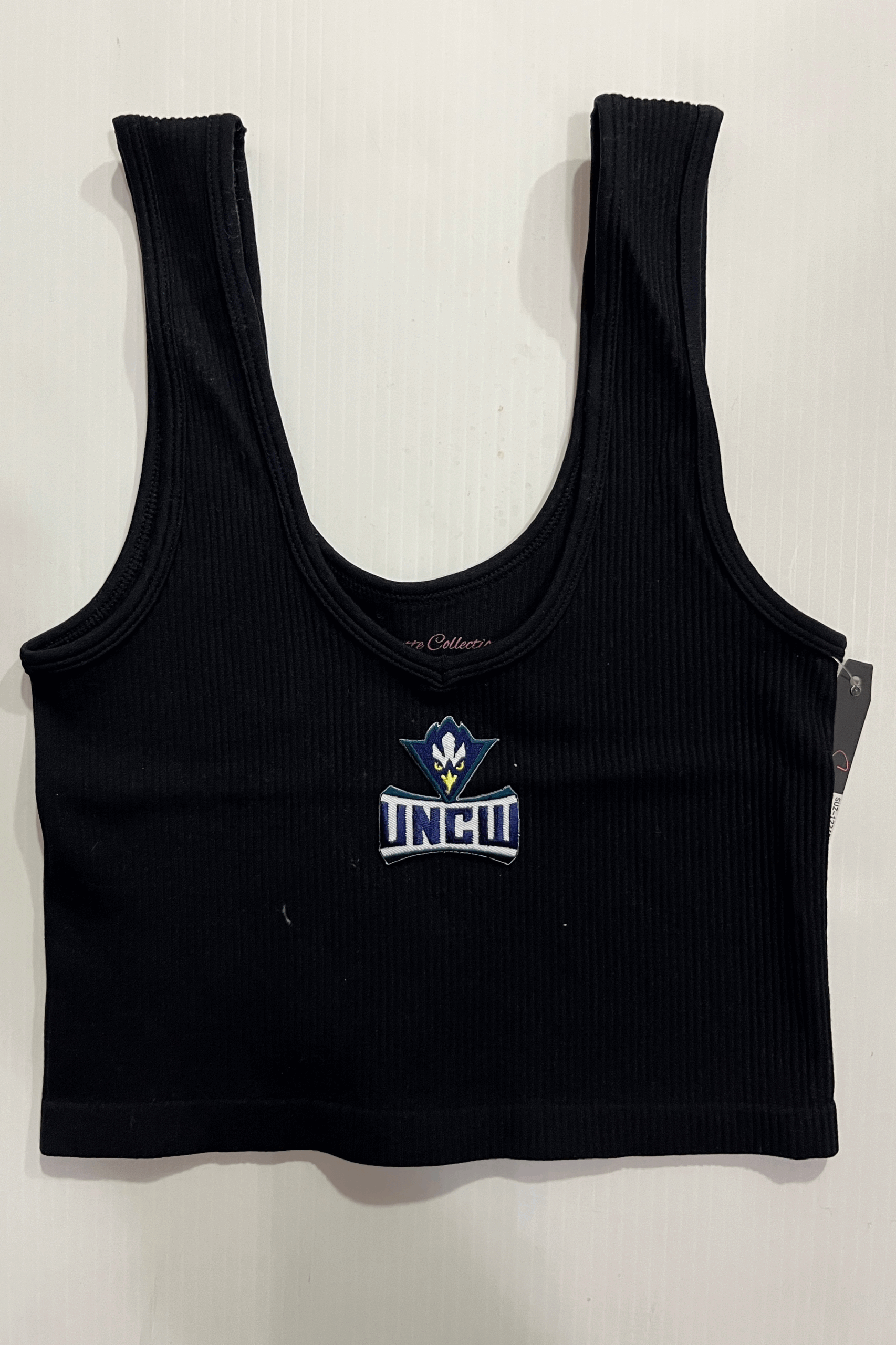 15 inch cropped 1X1 ribbed brami top with the UNCW logo. 92% Nylon 8% Spandex