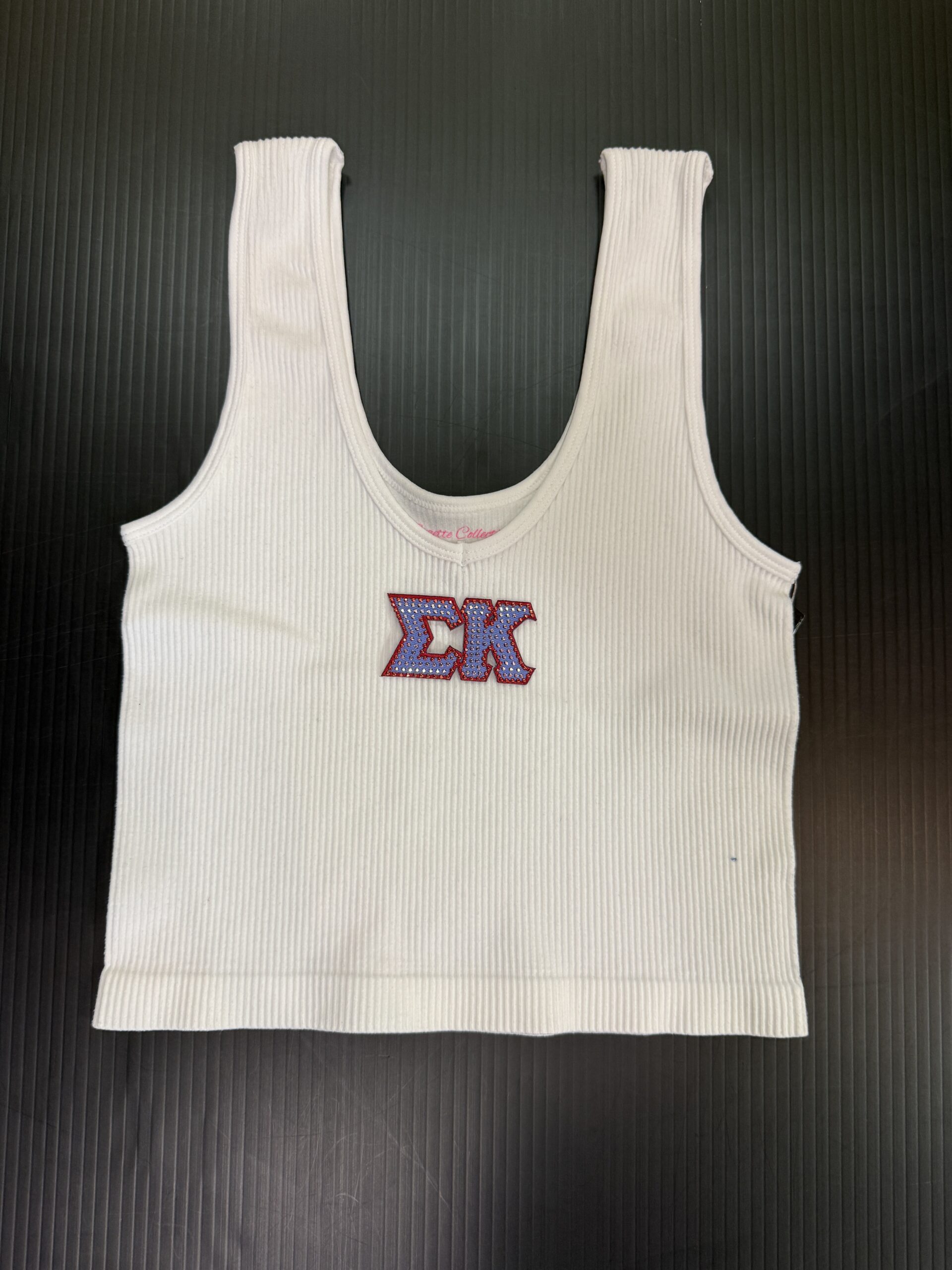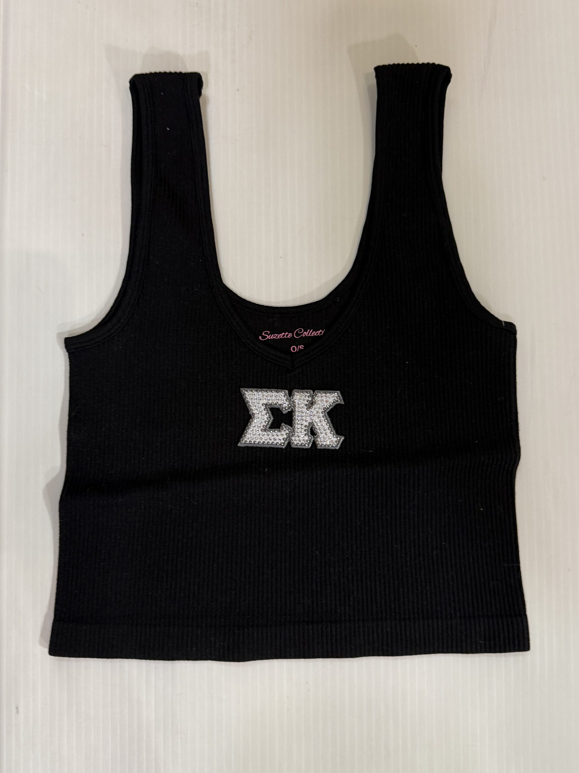 15 inch cropped 1X1 ribbed brami top with bling sorority logo. 92% Nylon 8% Spandex