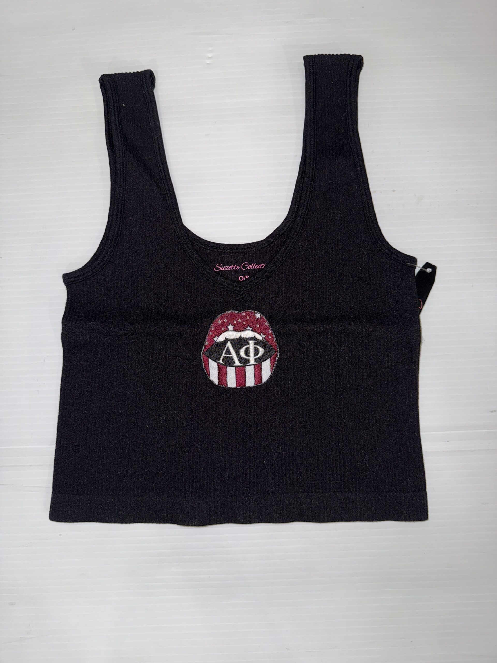 15 inch cropped 1X1 ribbed brami top with sorority logo. 92% Nylon 8% Spandex