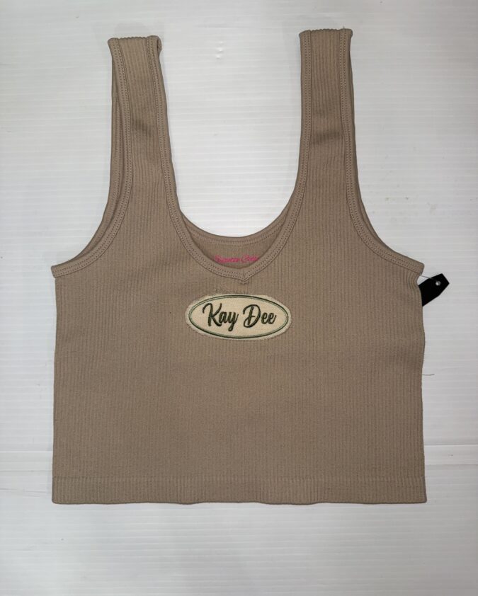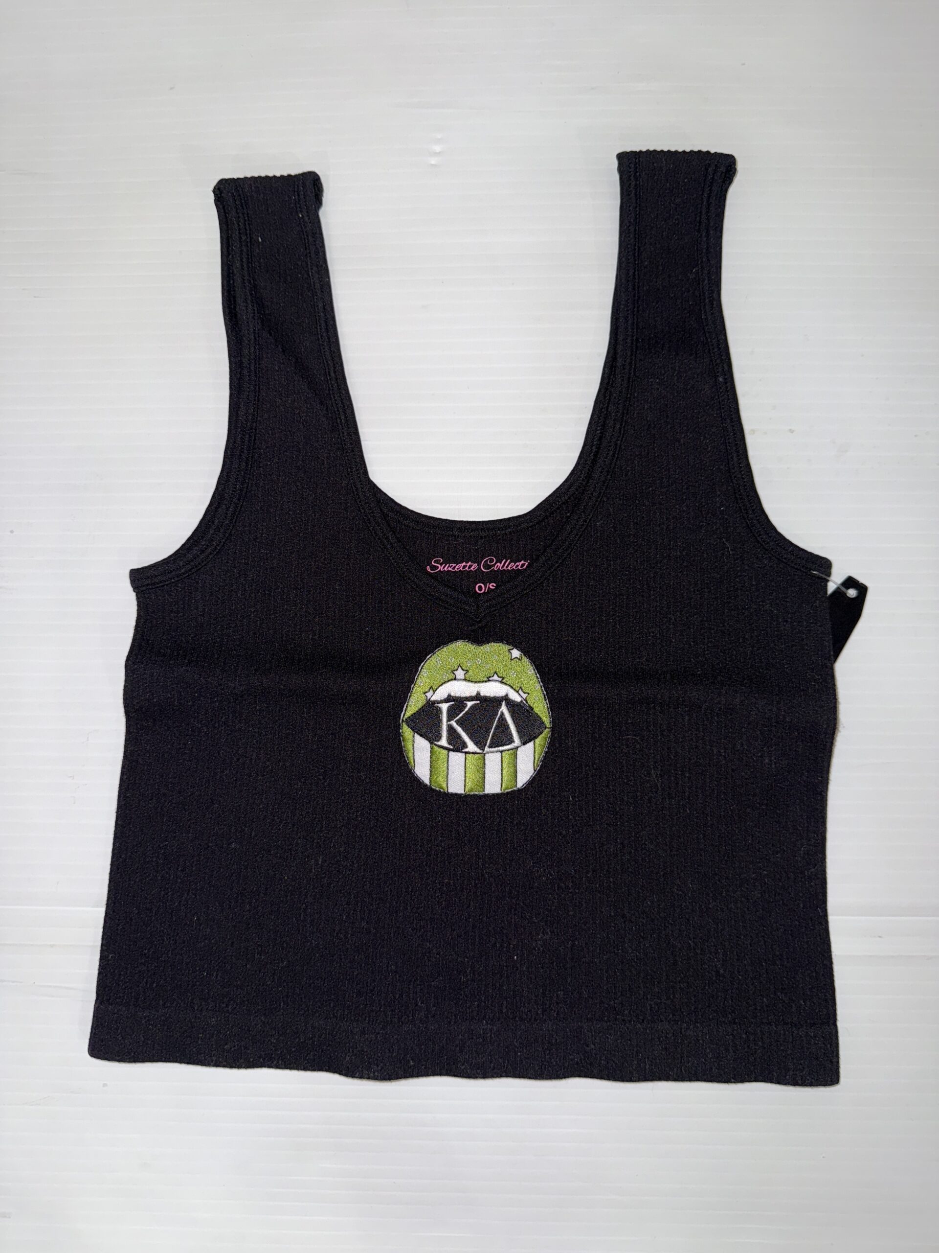 15 inch cropped 1X1 ribbed brami top with sorority logo. 92% Nylon 8% Spandex