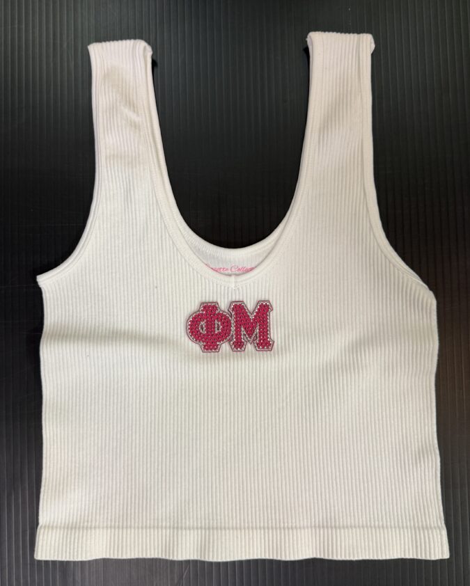 15 inch cropped 1X1 ribbed brami top with sorority logo. 92% Nylon 8% Spandex