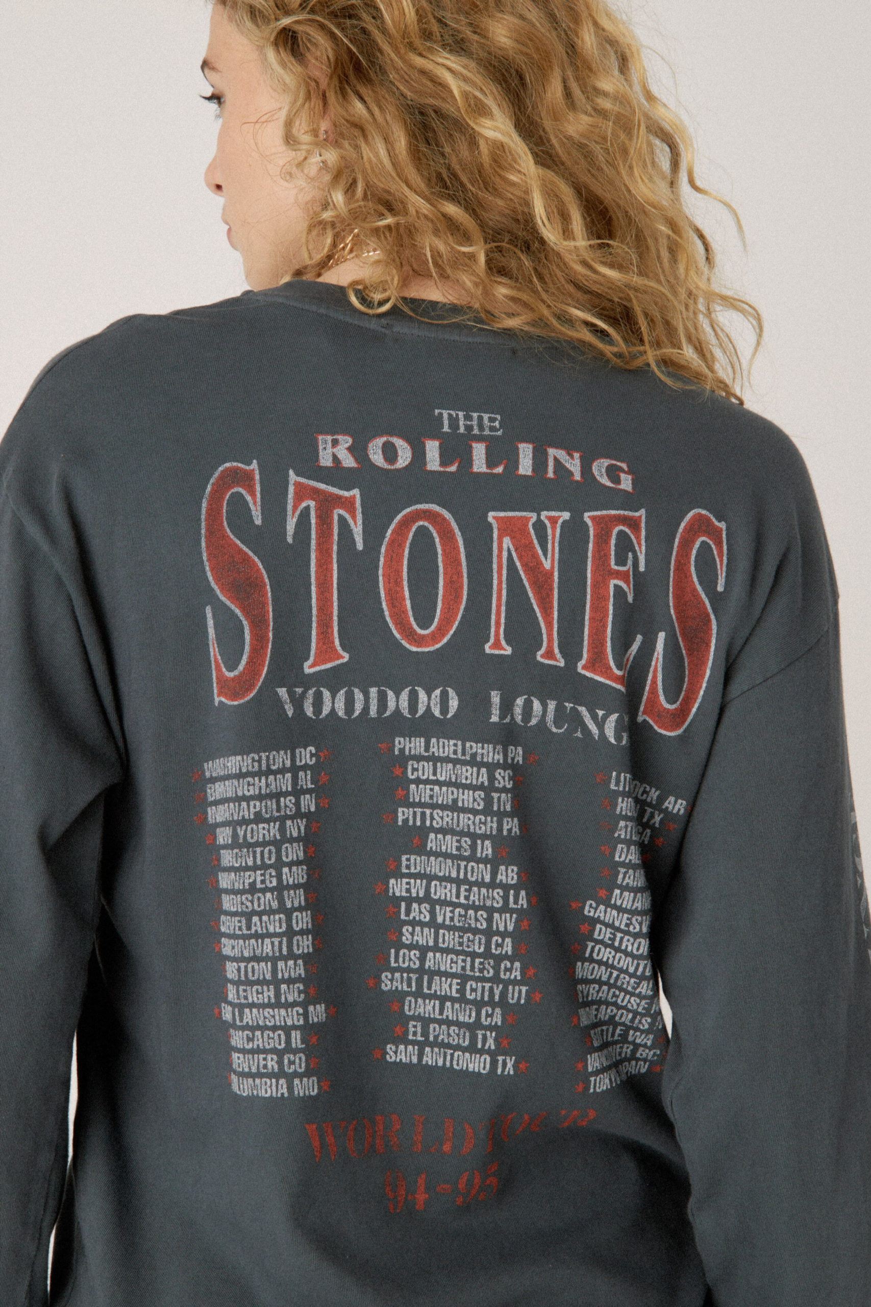This oversized, double-sided soft cotton long sleeve revisits the 20th UK (22nd American) album by the British rock band. A tour style tee, the front side features main attraction graphics and the group’s legendary tongue and lips logo, while the back highlights all of the 94-95 world tour stops.