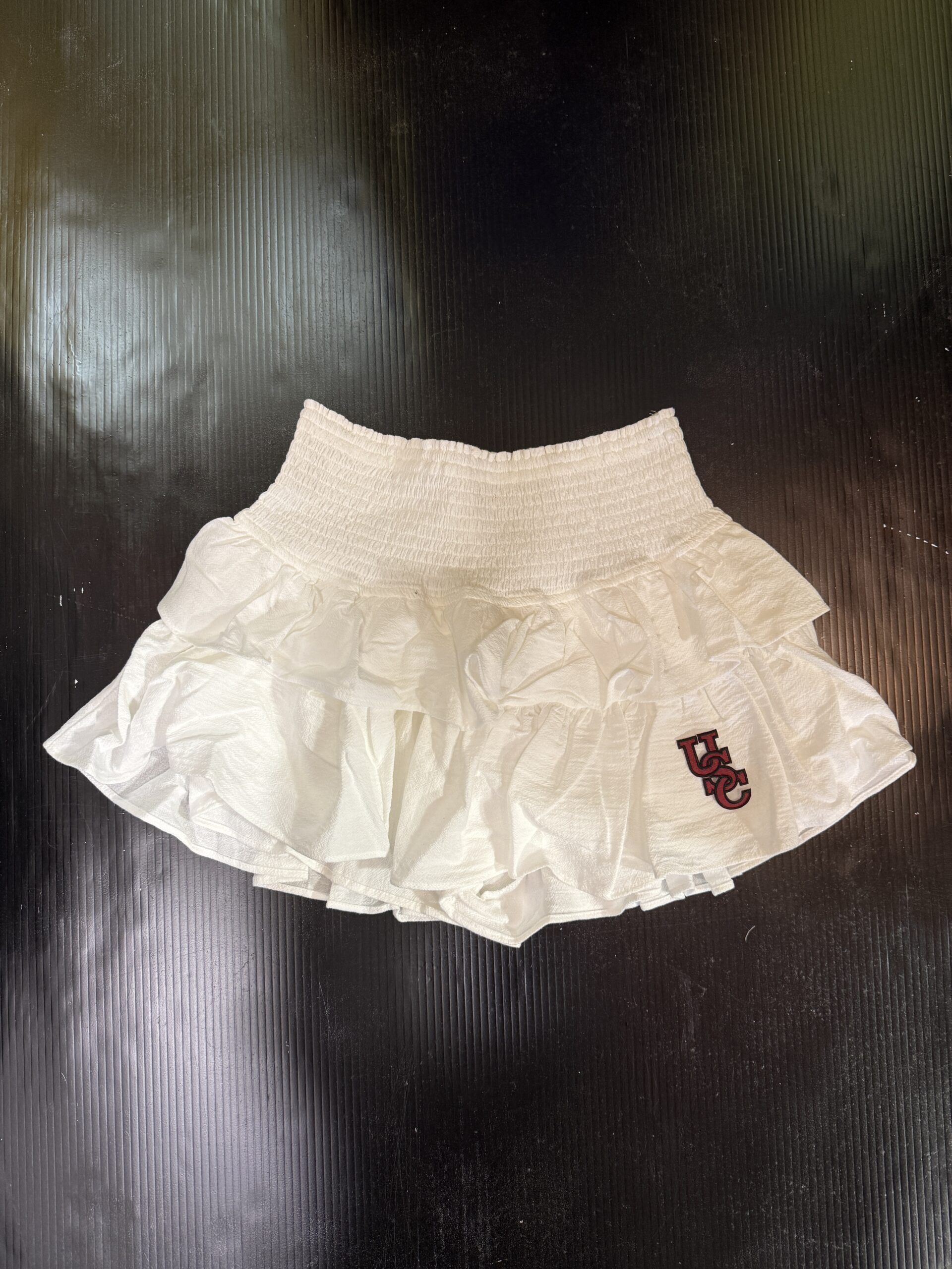 100% cotton tiered skort (shorts underneath) with smocked waist and college logo. Perfect for Game Day!