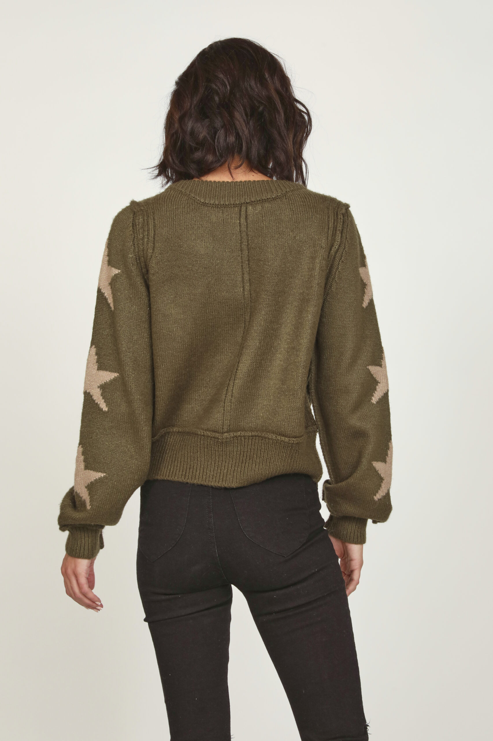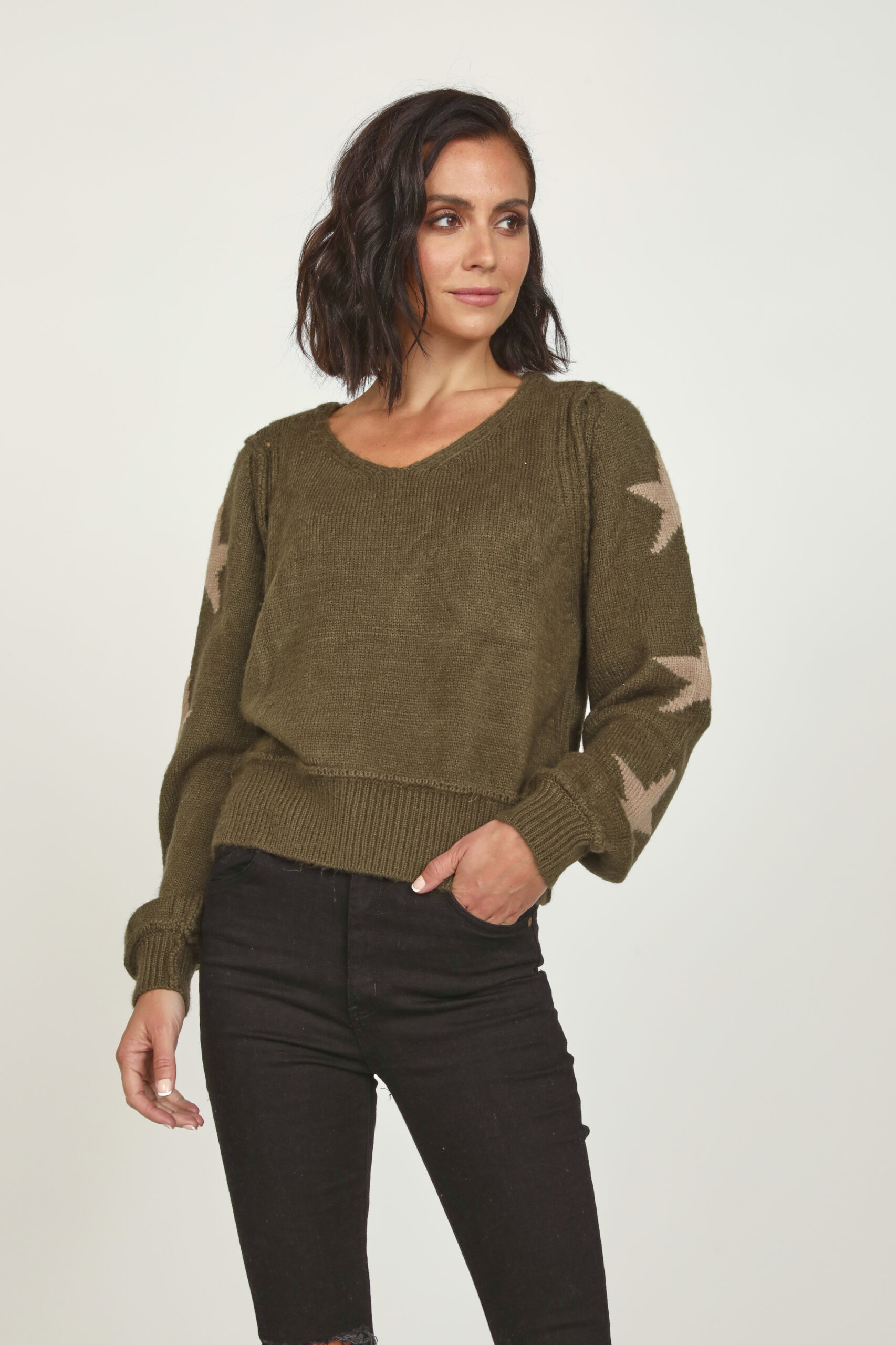 Chunky v-neck sweater with three stars on each sleeve and wide banded bottom.