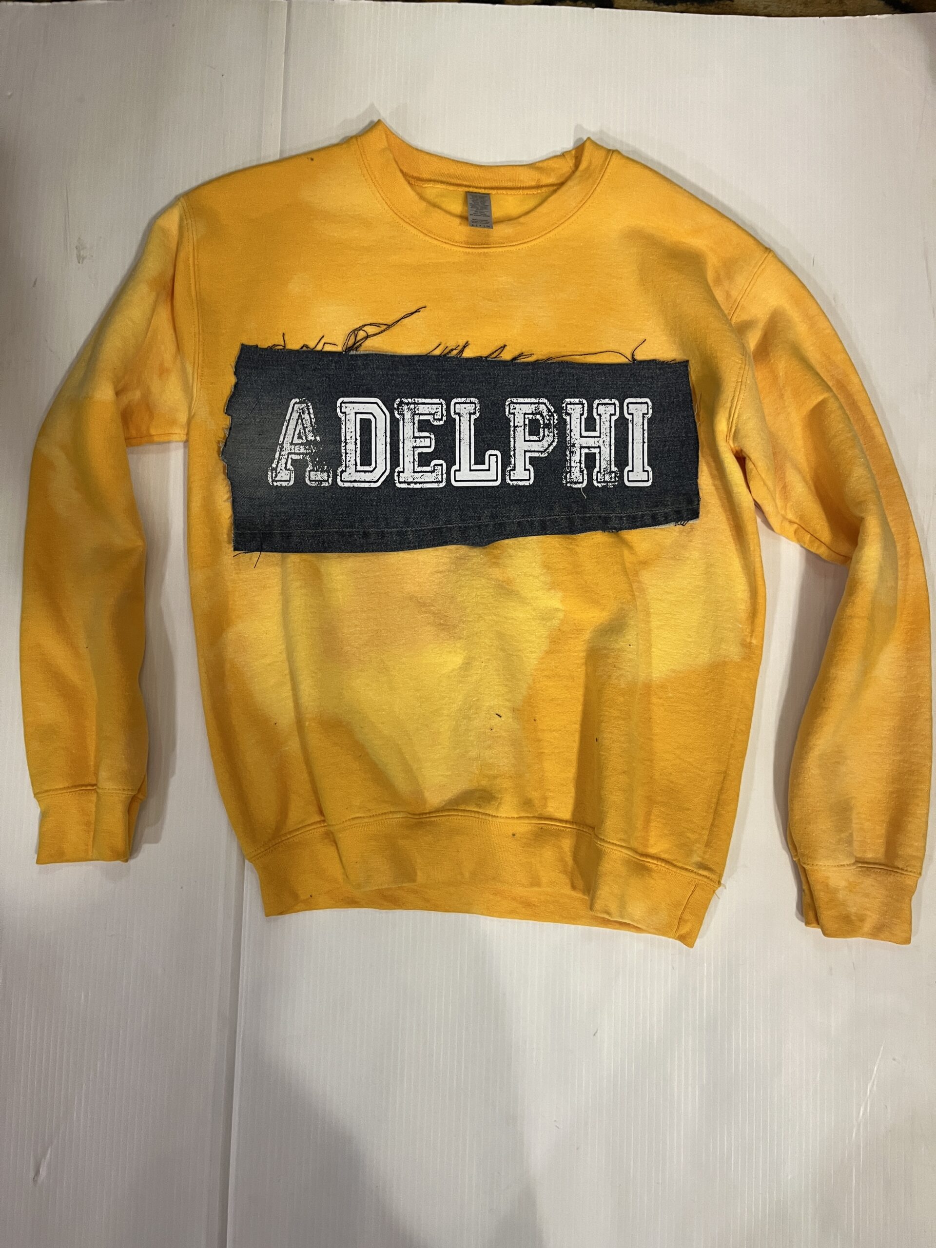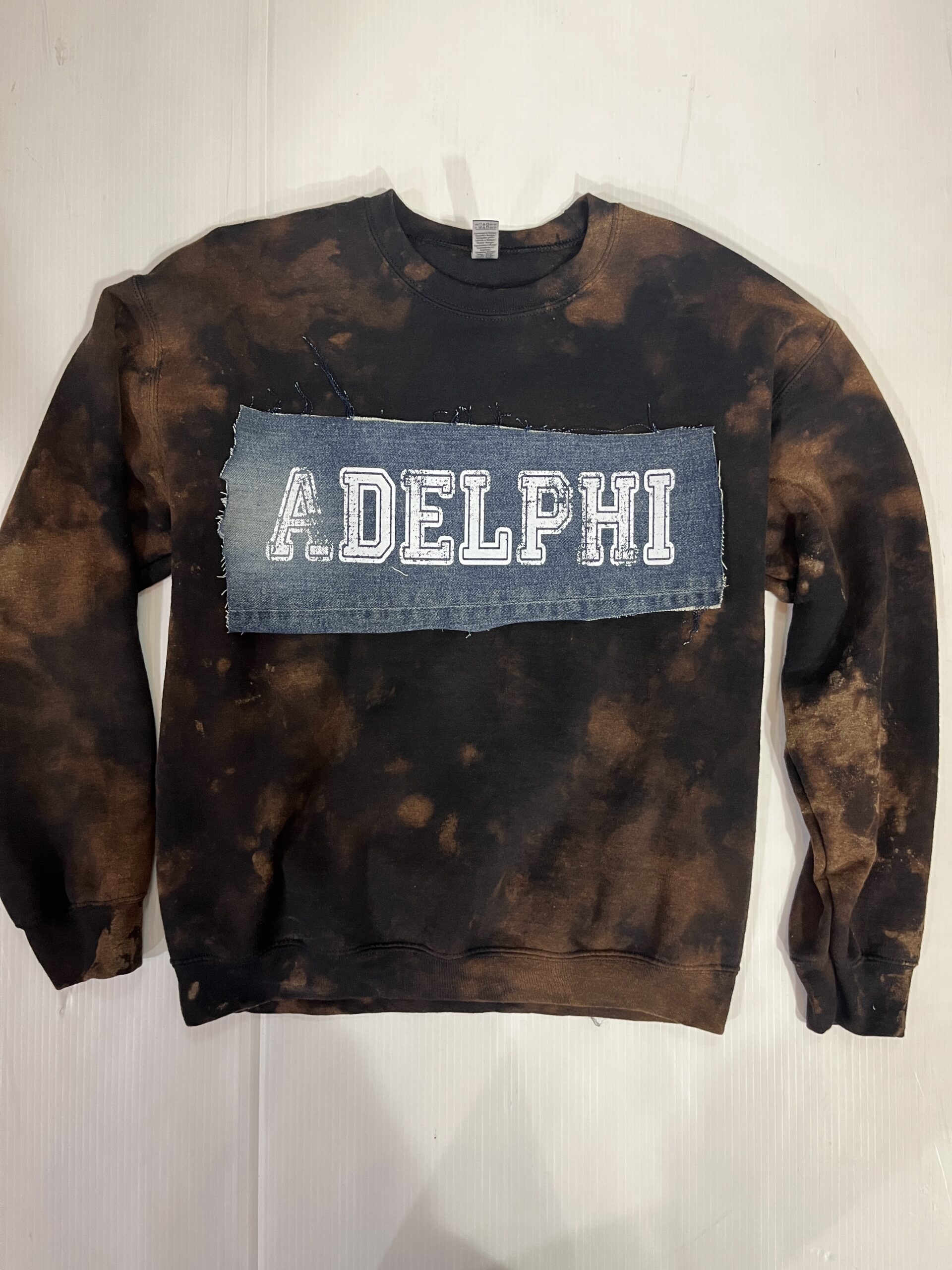 Comfy soft crewneck sweatshirt with vintage denim patch sewn across the chest.