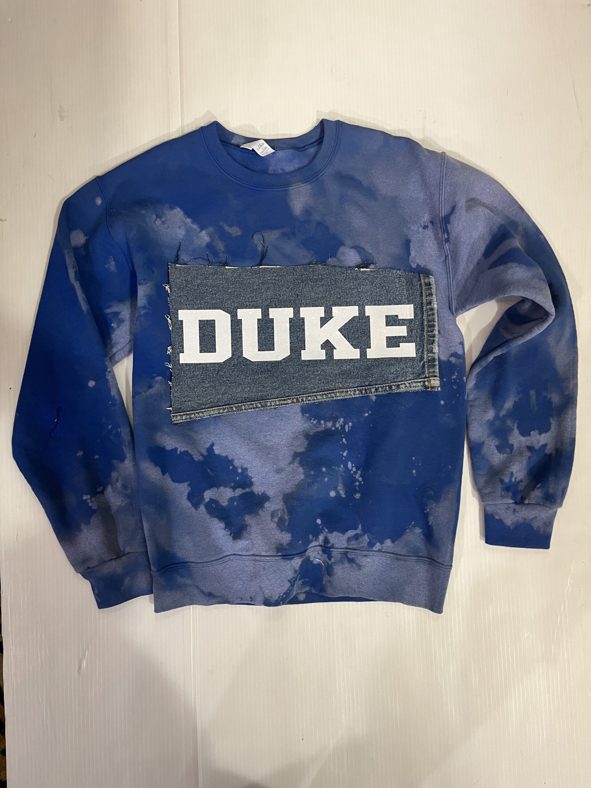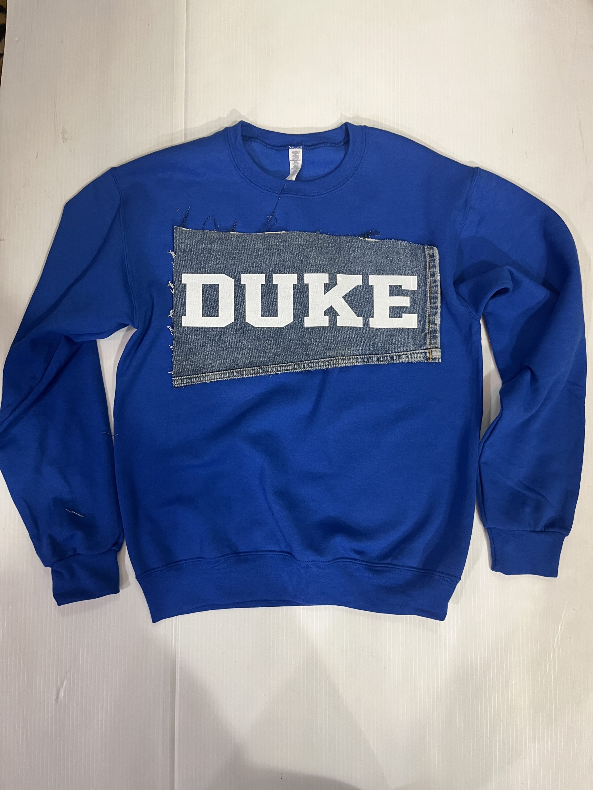 Comfy soft crewneck sweatshirt with vintage denim patch sewn across the chest.