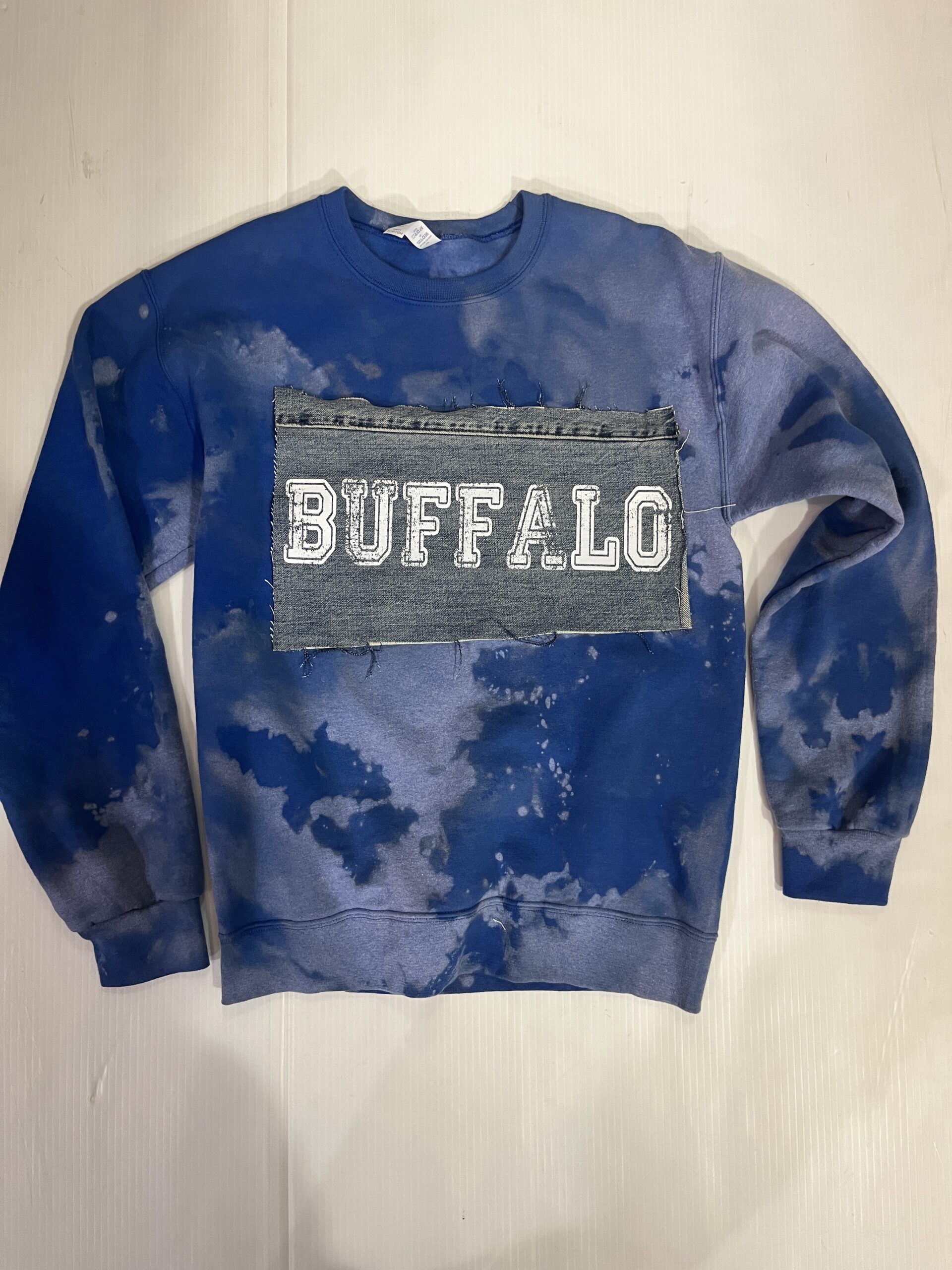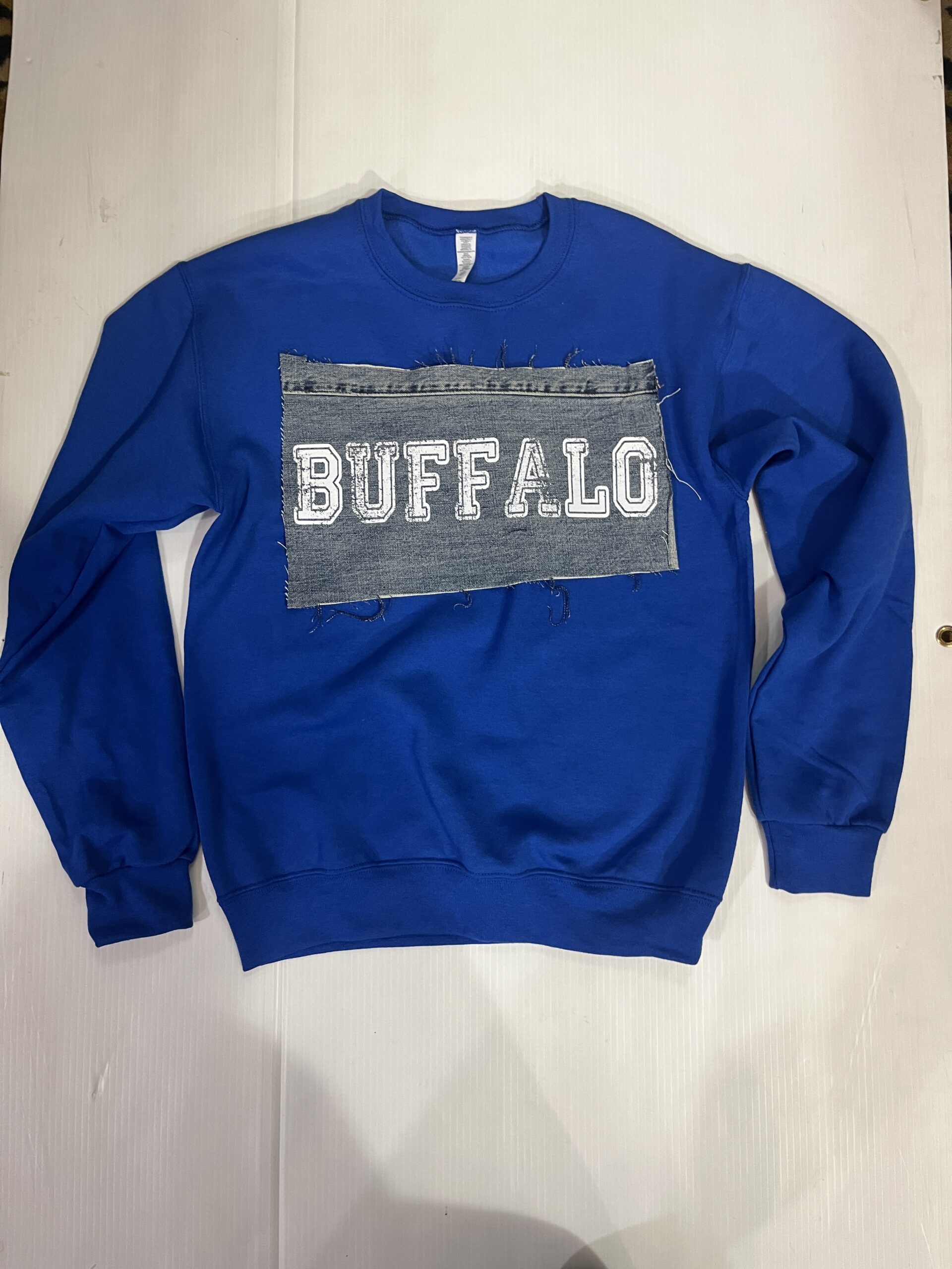 Comfy soft crewneck sweatshirt with vintage denim patch sewn across the chest.