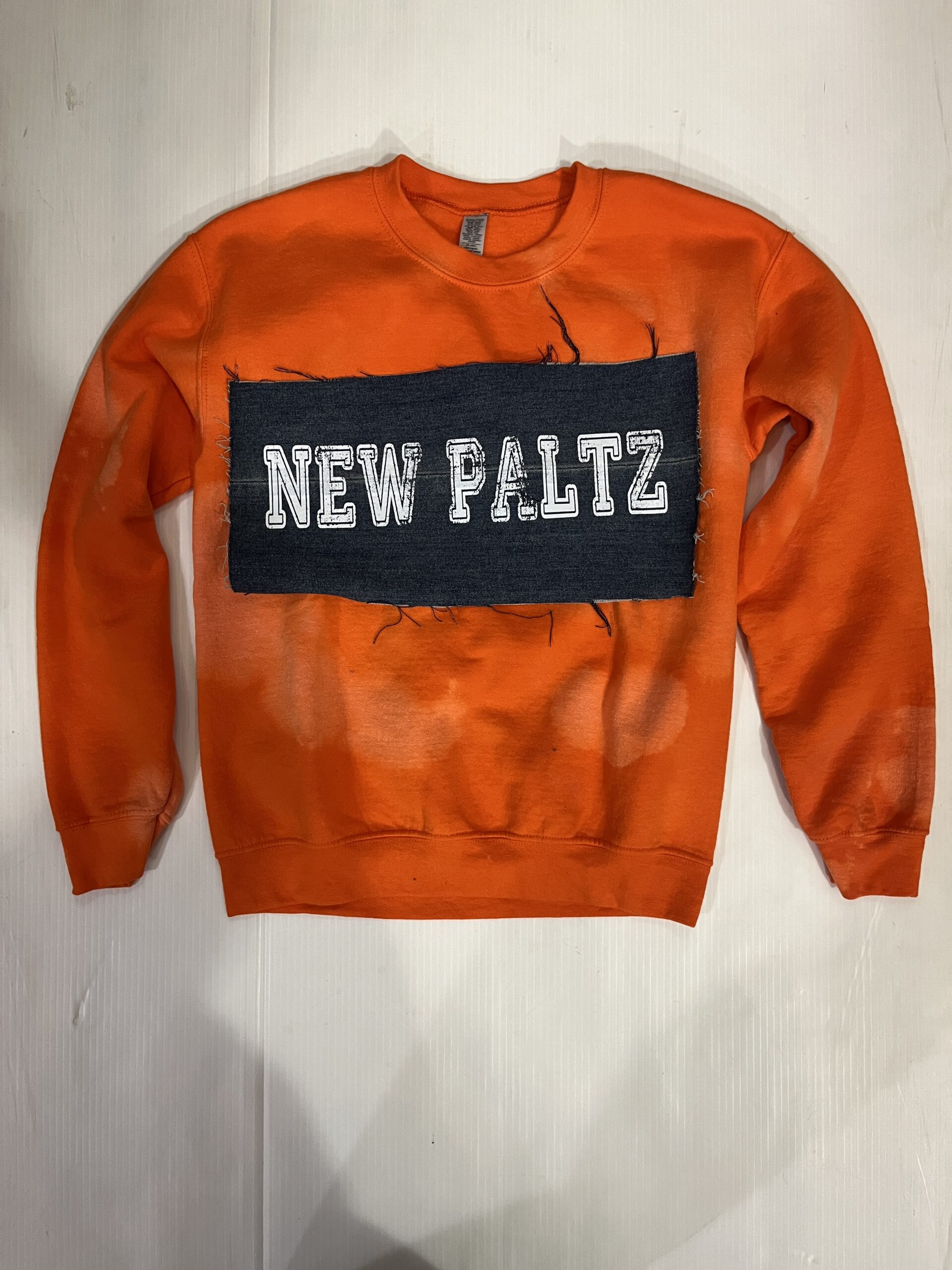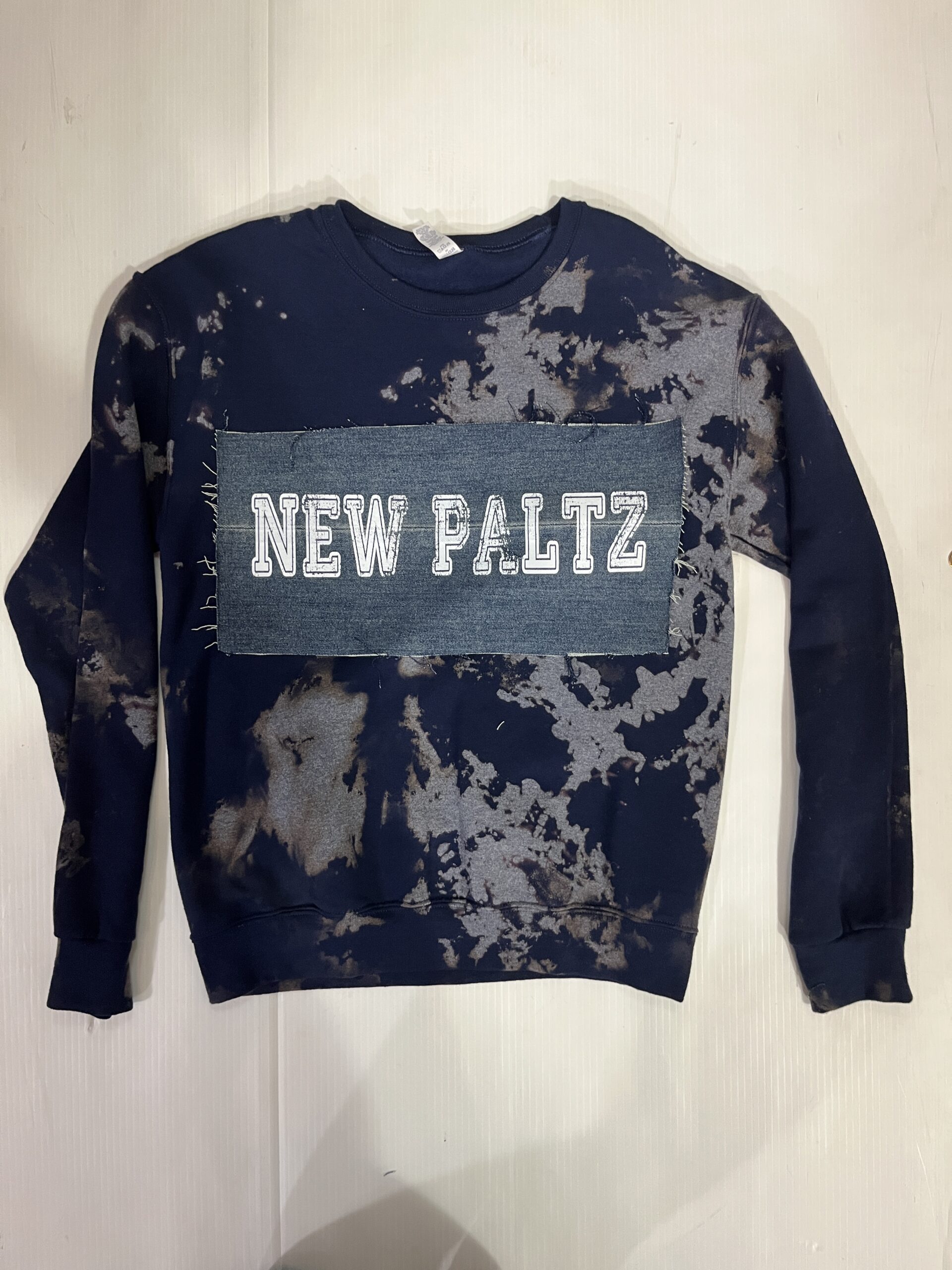 Comfy soft crewneck sweatshirt with vintage denim patch sewn across the chest.