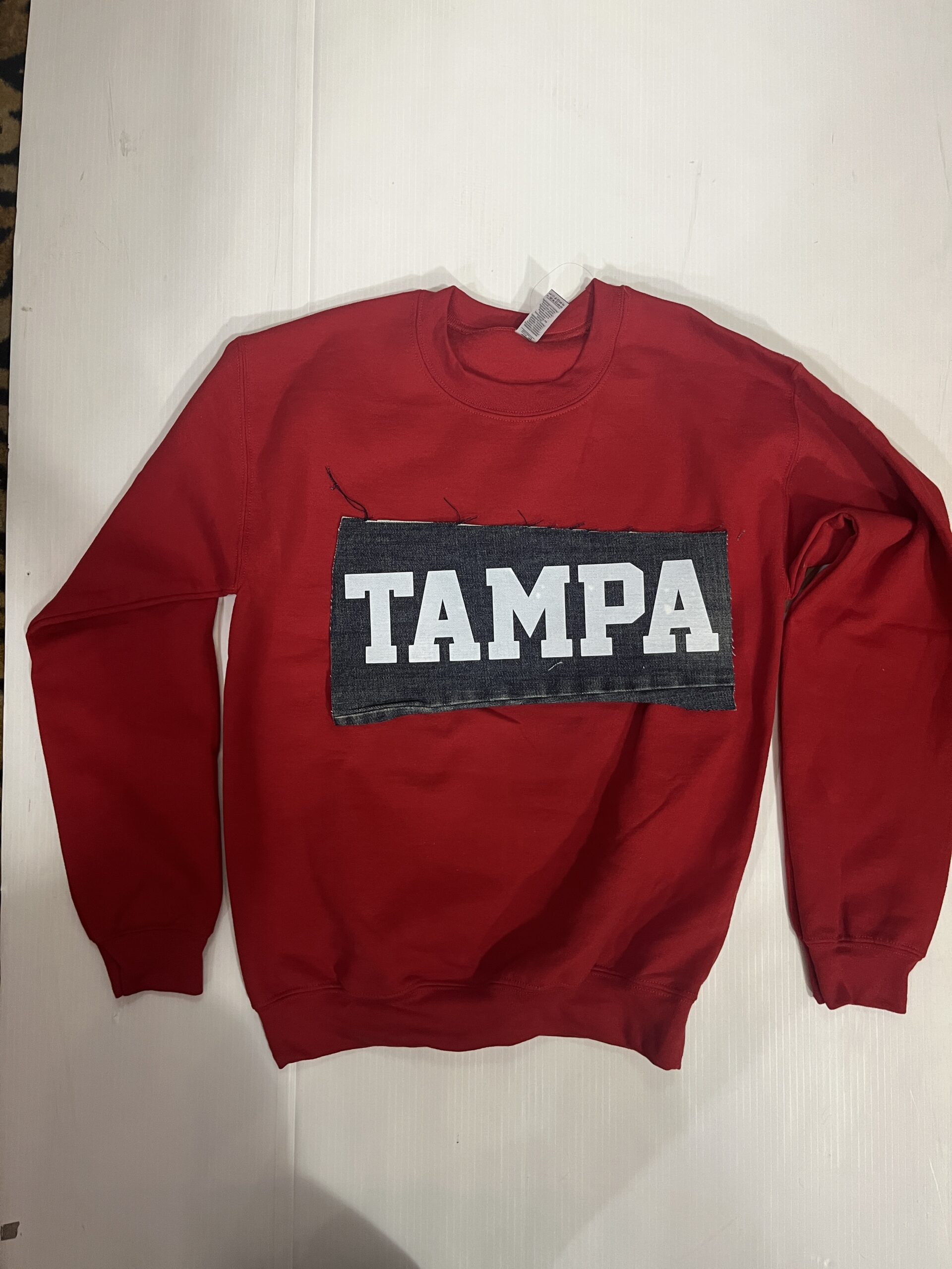 Comfy soft crewneck sweatshirt with vintage denim patch sewn across the chest.