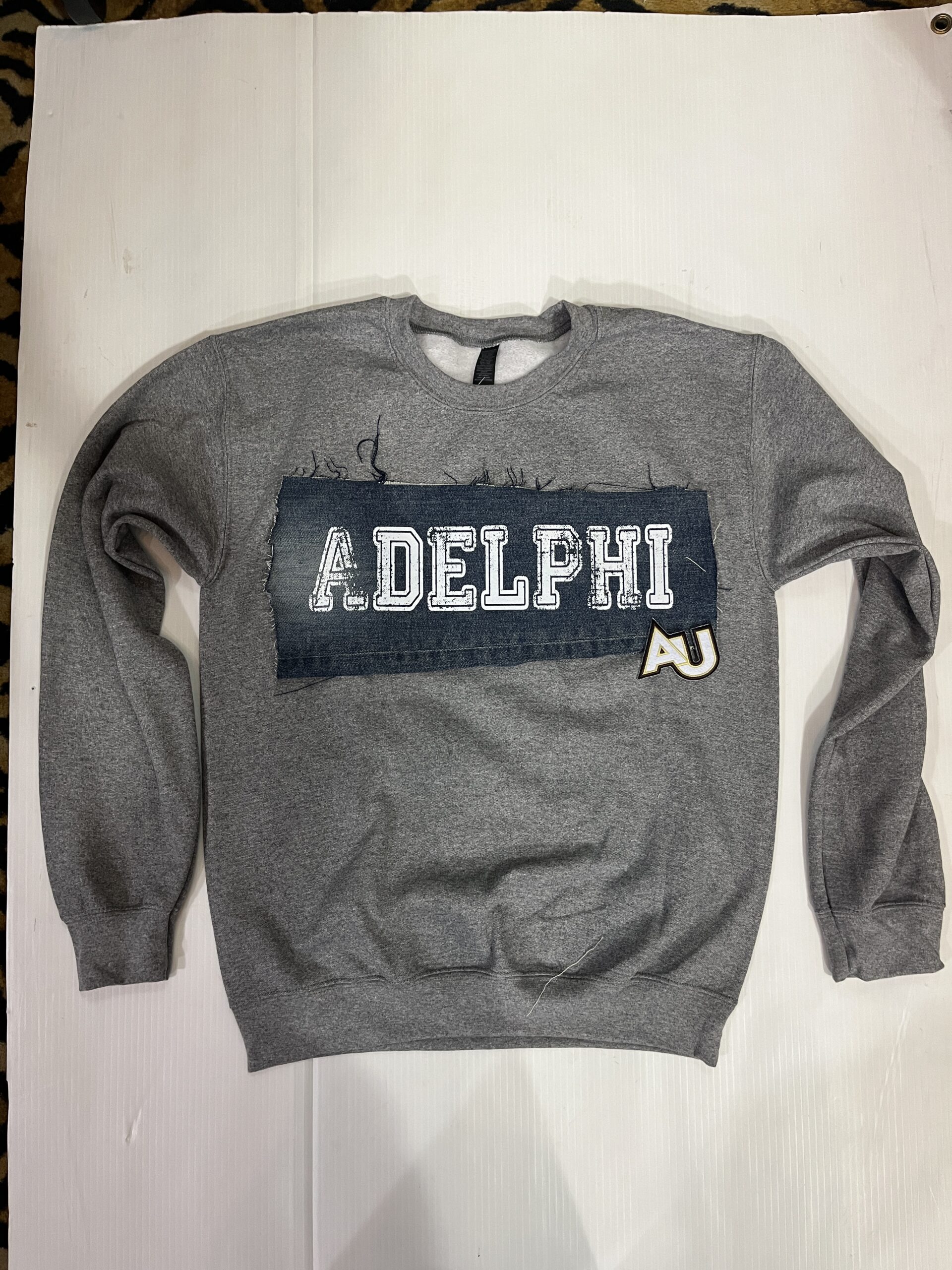 Comfy soft crewneck sweatshirt with vintage denim patch sewn across the chest and embroidered logo patch