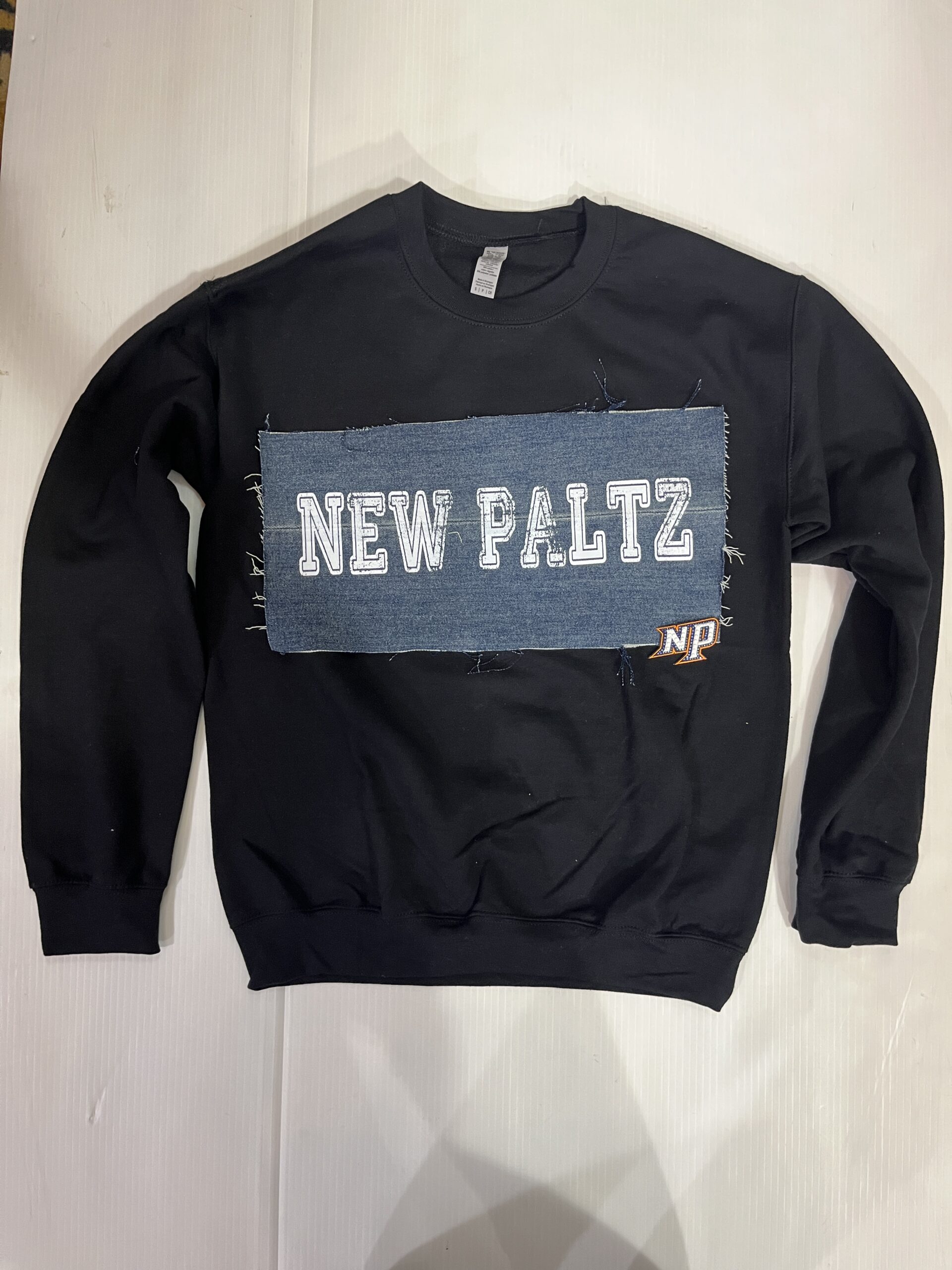 Comfy soft crewneck sweatshirt with vintage denim patch sewn across the chest and embroidered logo patch