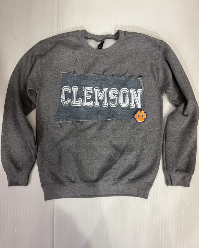 Comfy soft crewneck sweatshirt with vintage denim patch sewn across the chest and embroidered logo patch