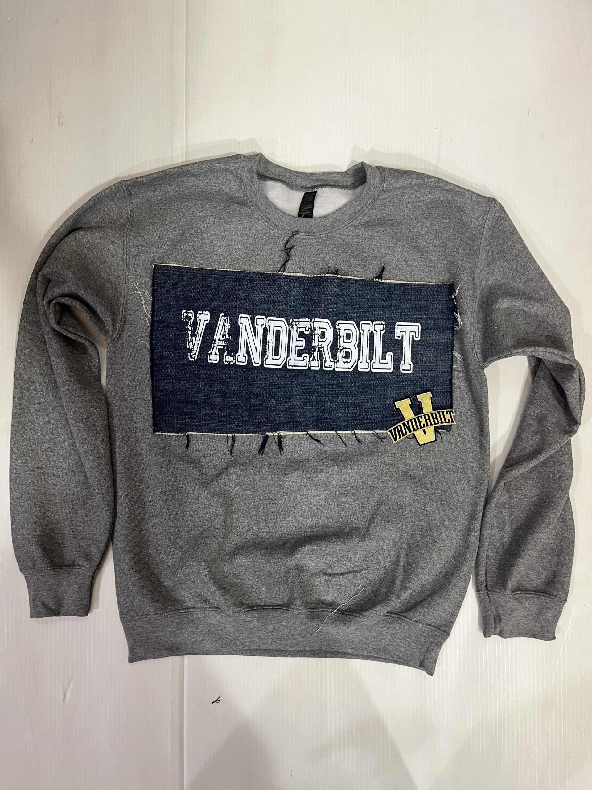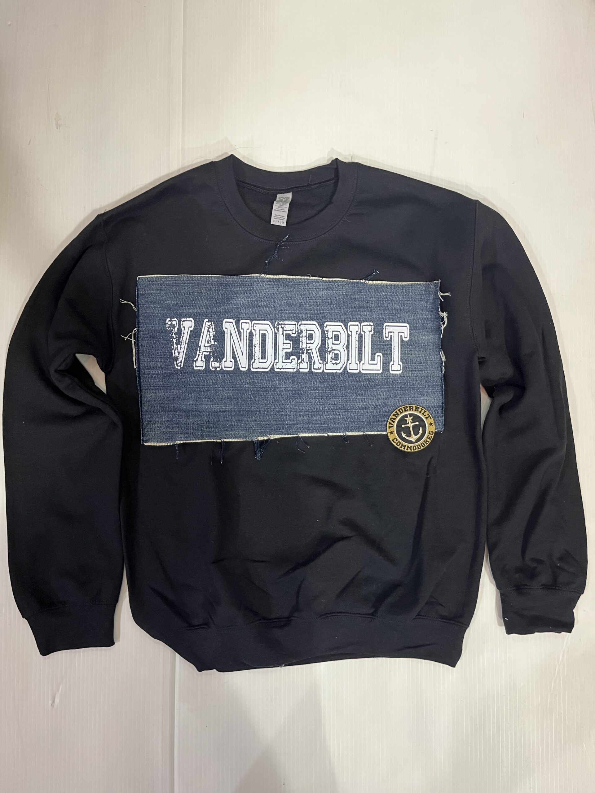 Comfy soft crewneck sweatshirt with vintage denim patch sewn across the chest and embroidered logo patch