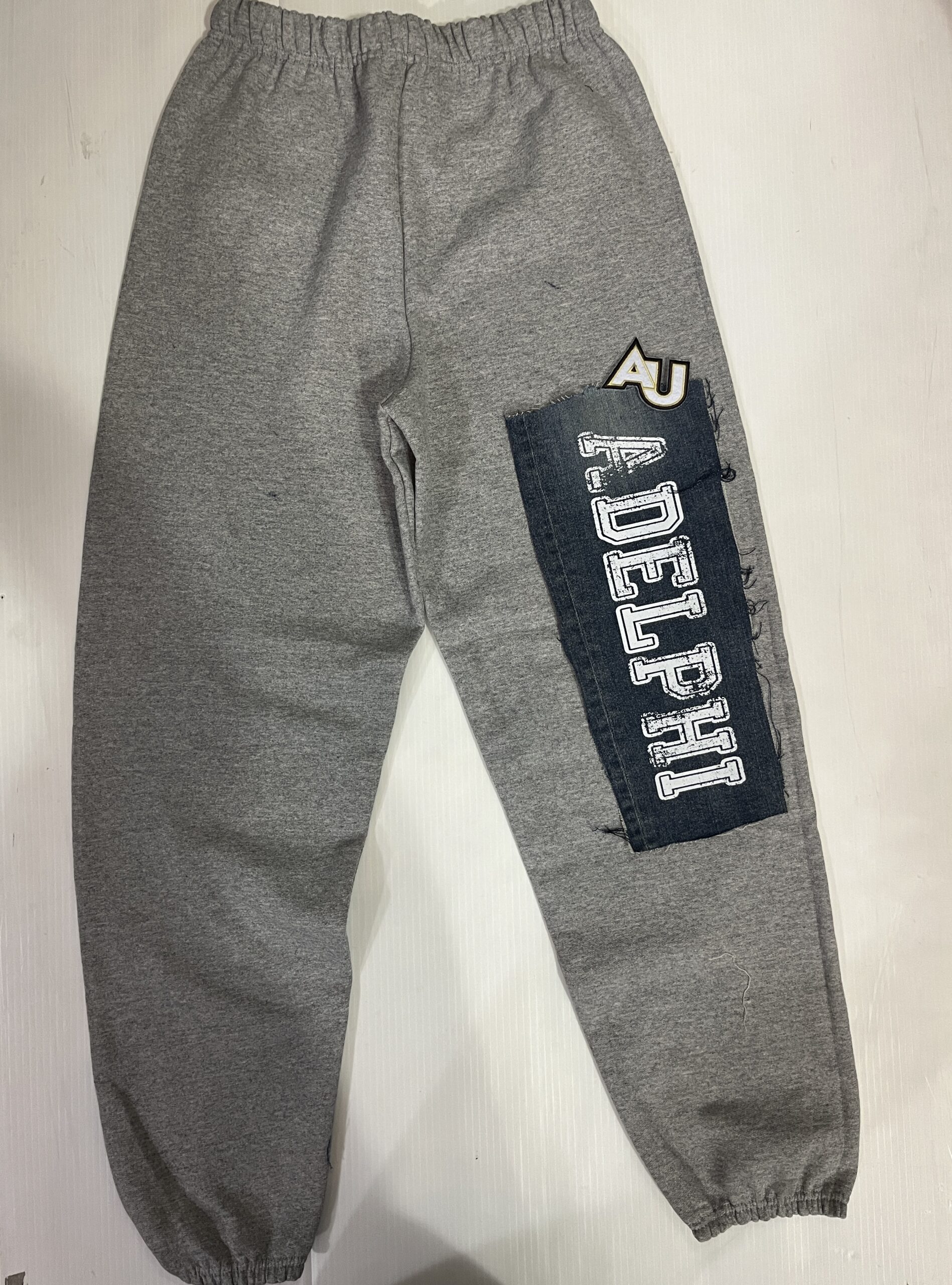 Comfy soft sweatpant with vintage denim patch sewn on the leg and embroidered college logo patch. Old School baggy fit.