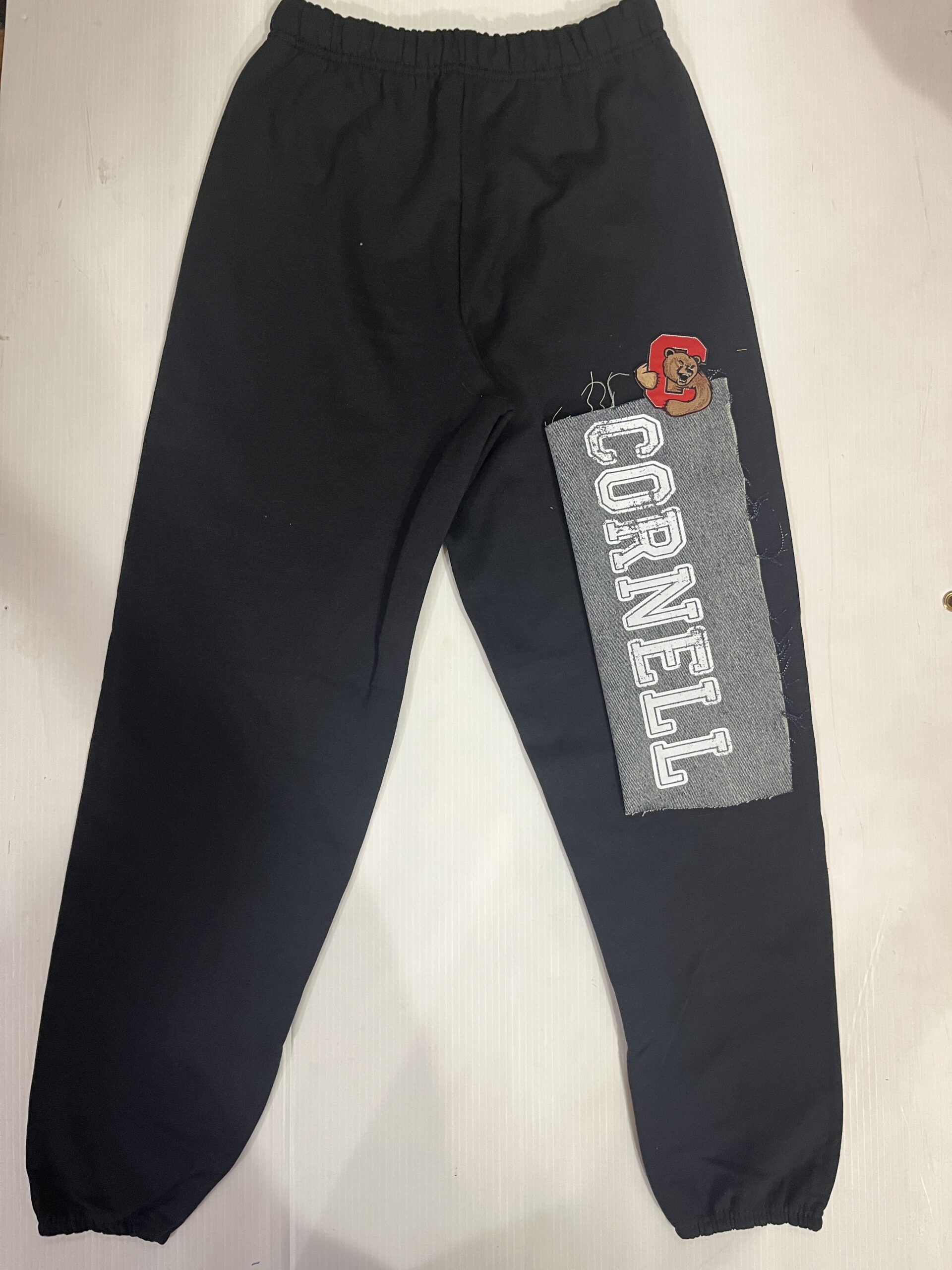 Comfy soft sweatpant with vintage denim patch sewn on the leg and embroidered college logo patch. Old School baggy fit.