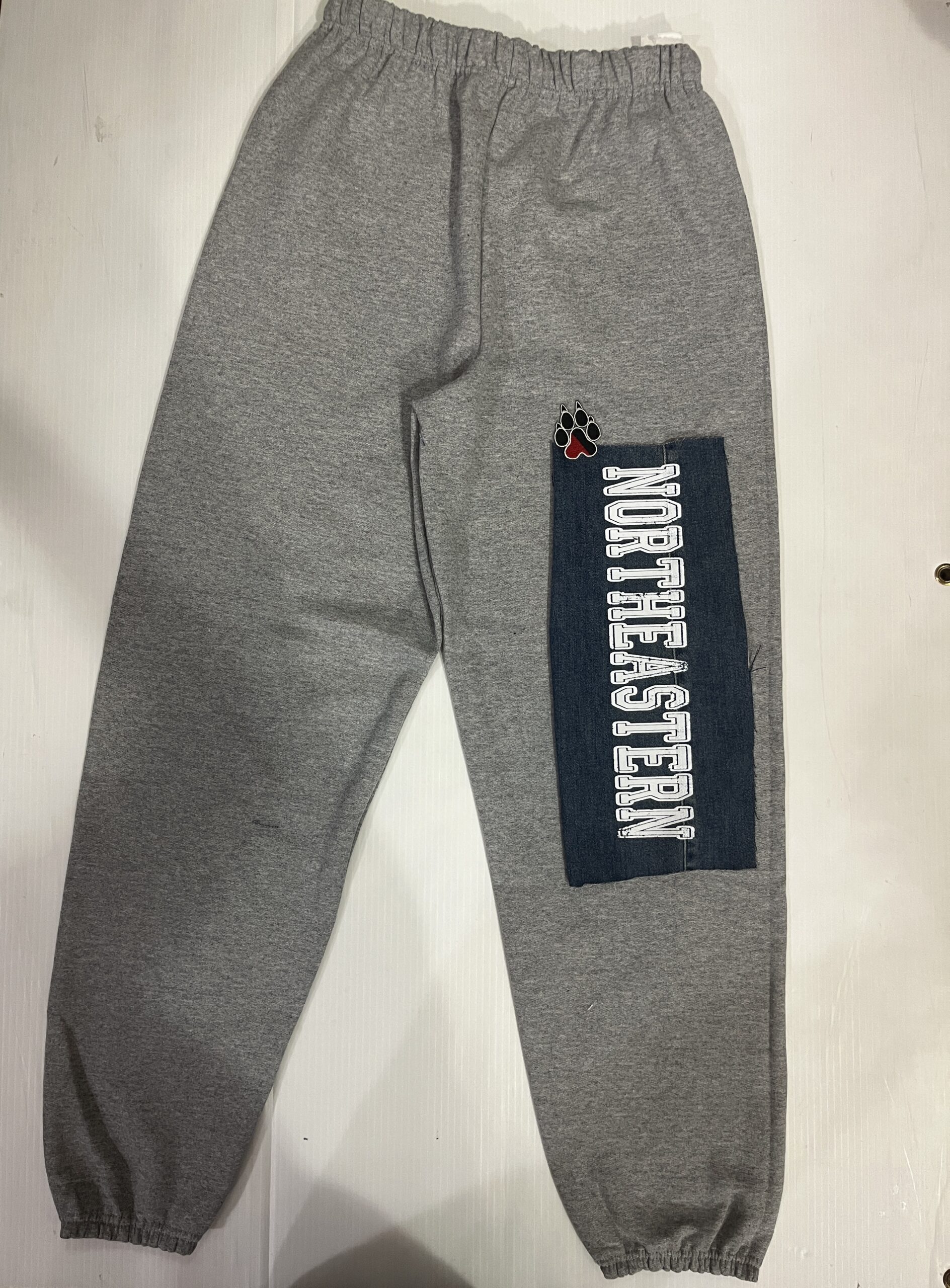 Comfy soft sweatpant with vintage denim patch sewn on the leg and embroidered college logo patch. Old School baggy fit.