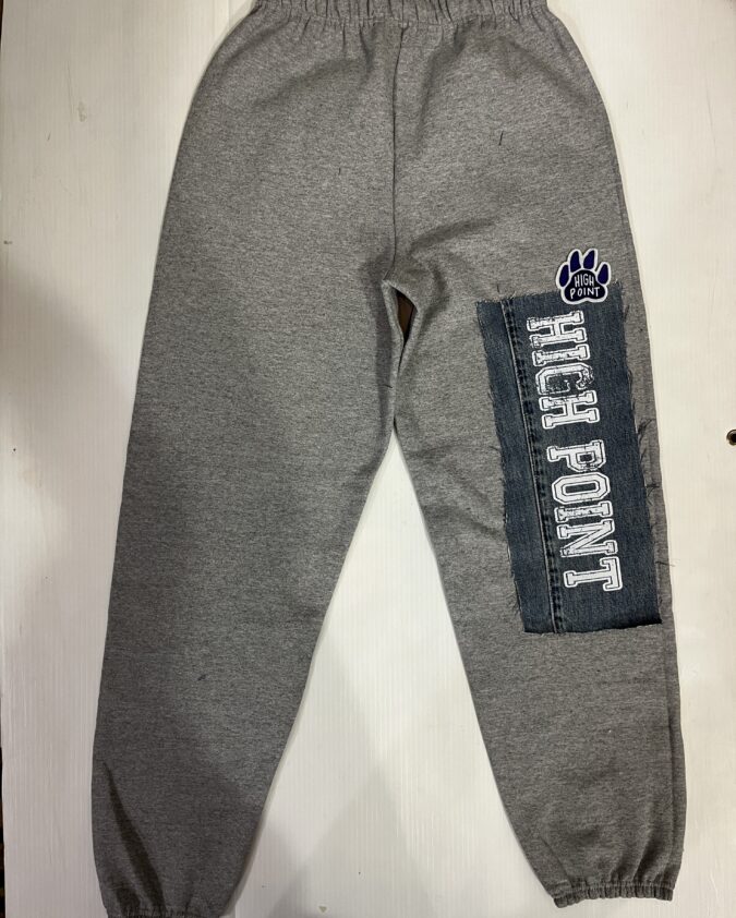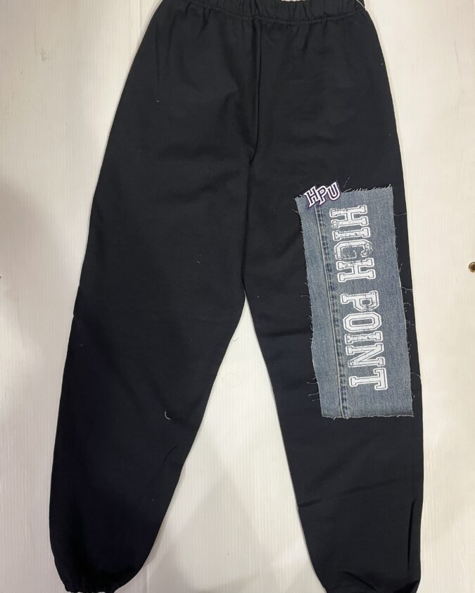 Comfy soft sweatpant with vintage denim patch sewn on the leg and embroidered college logo patch. Old School baggy fit.