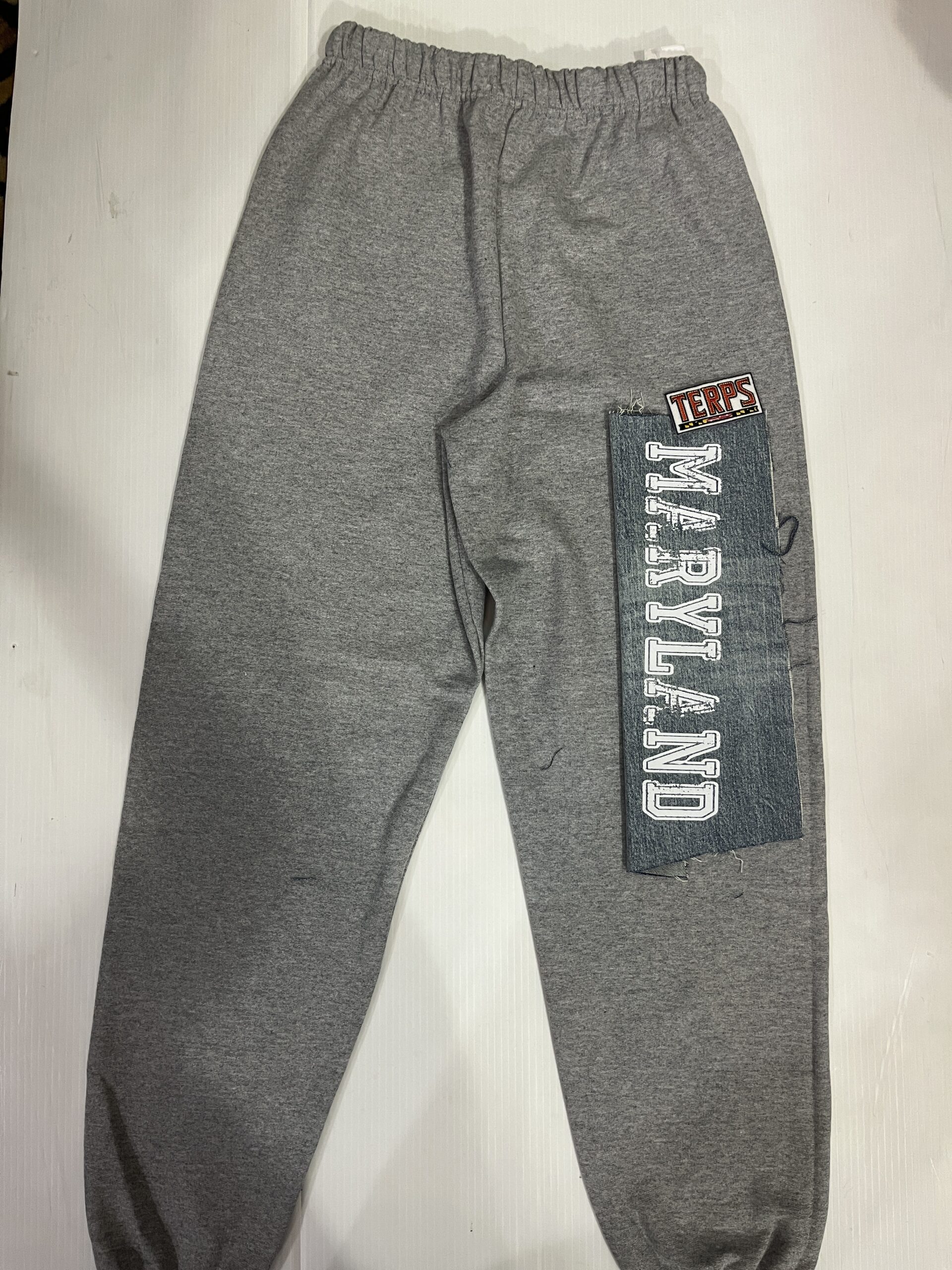 Comfy soft sweatpant with vintage denim patch sewn on the leg and embroidered college logo patch. Old School baggy fit.