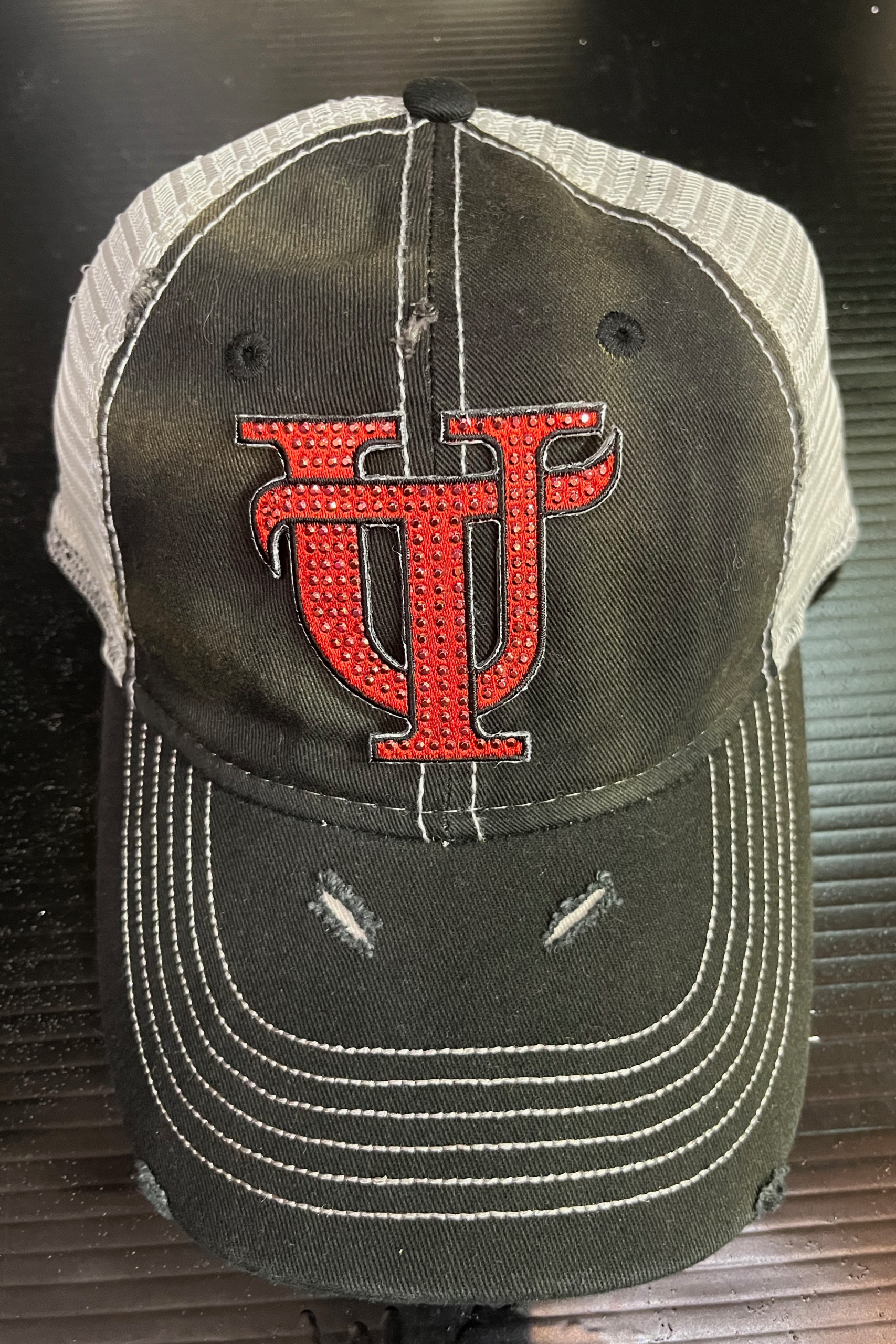 Deconstructed vintage unisex trucker hat with rips and bling college logo